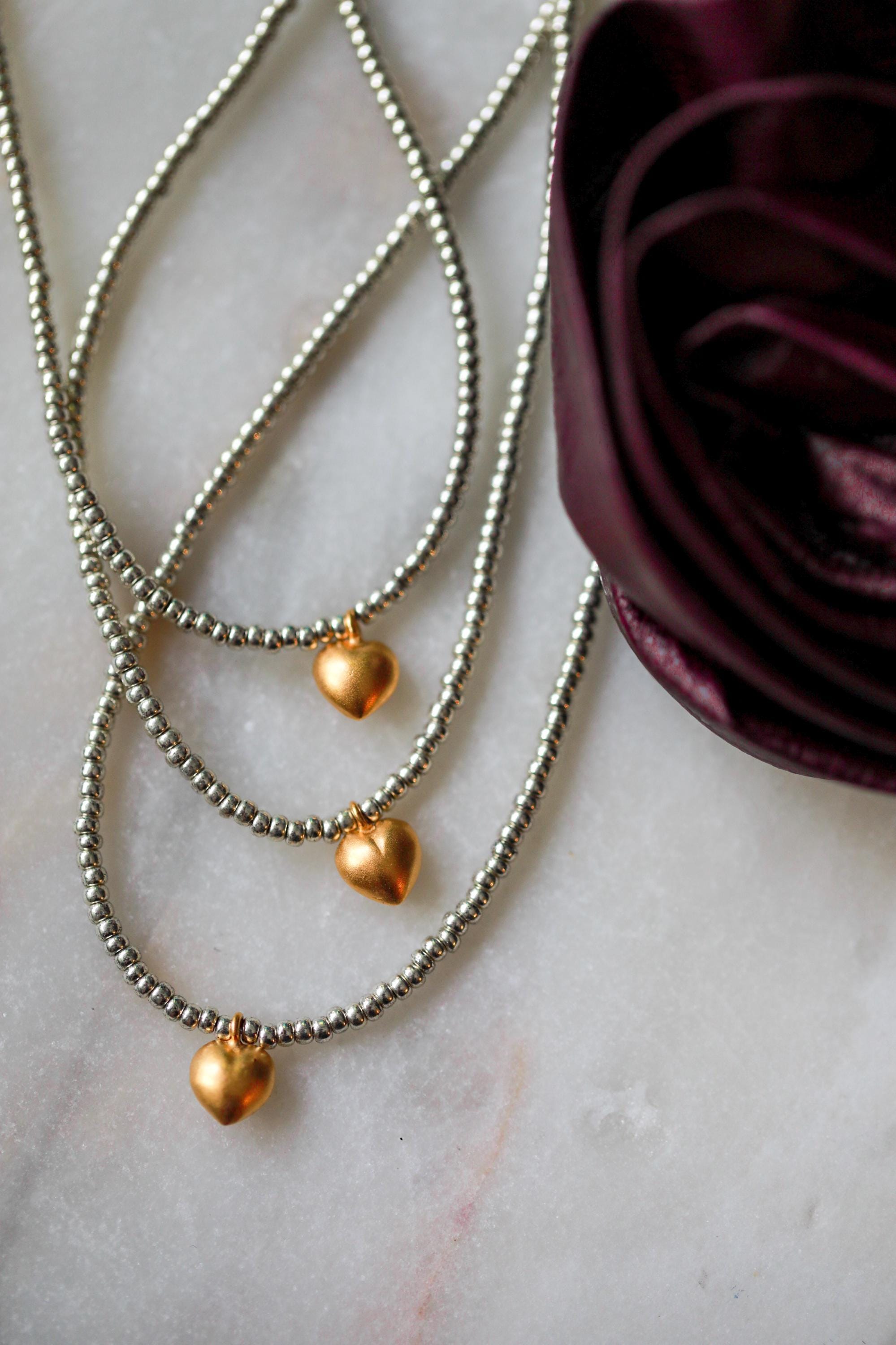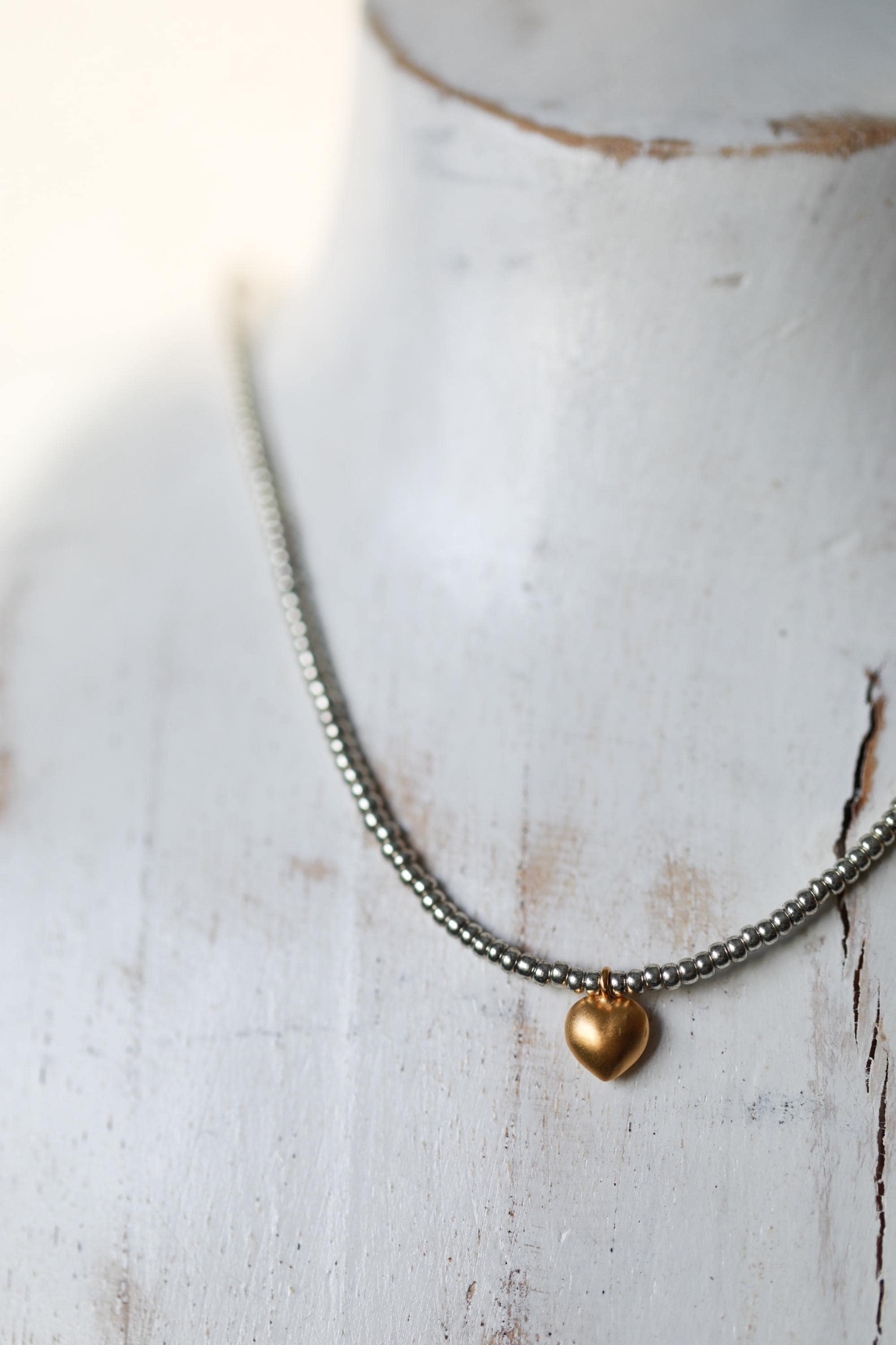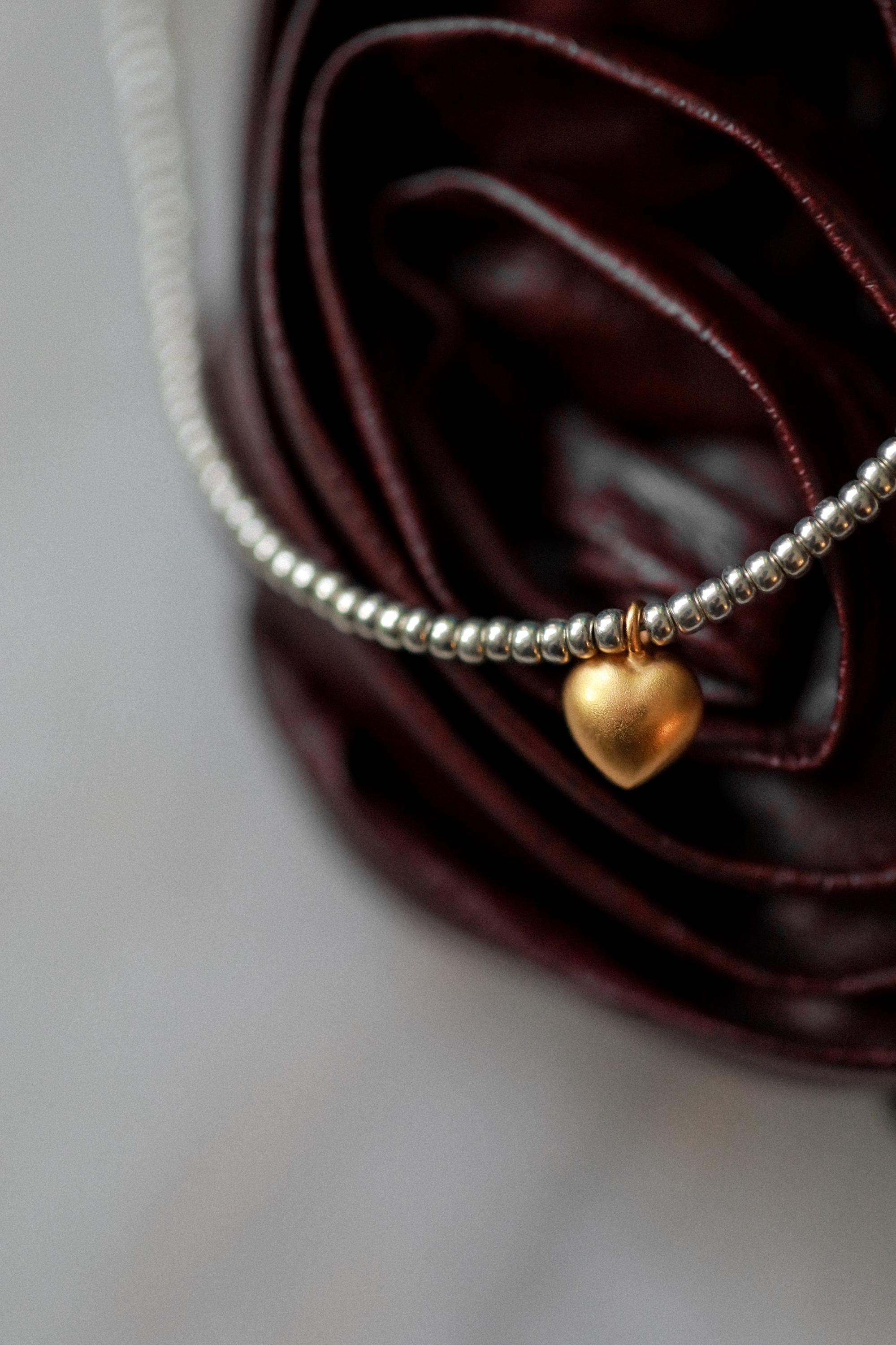 At the center is a petite puff heart charm, crafted from sterling silver and finished with 24K brushed gold plating for a soft, satin glow. The heart floats along a strand of premium silver-toned glass beads, creating an elegant contrast that feels modern, minimal, and timeless.
