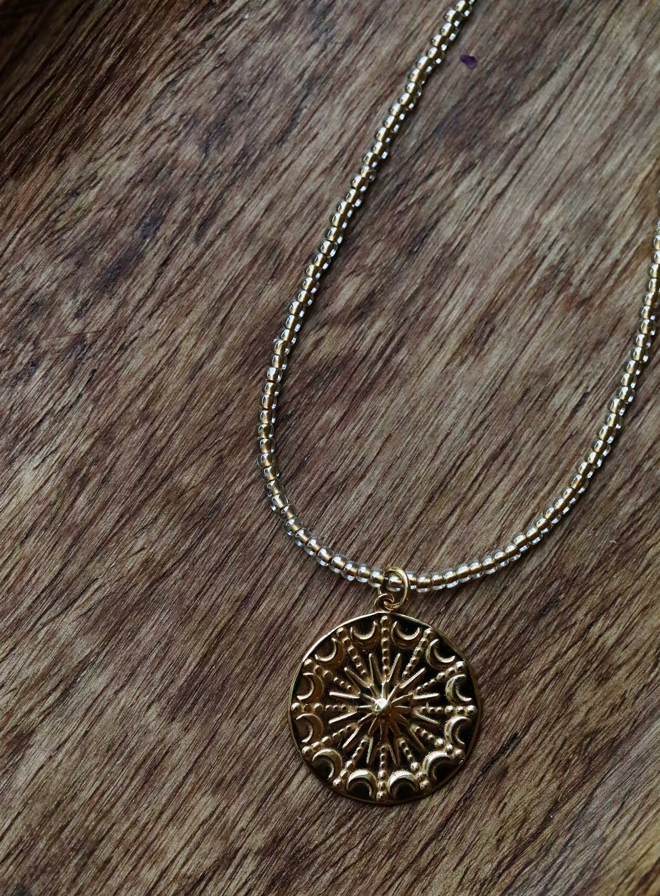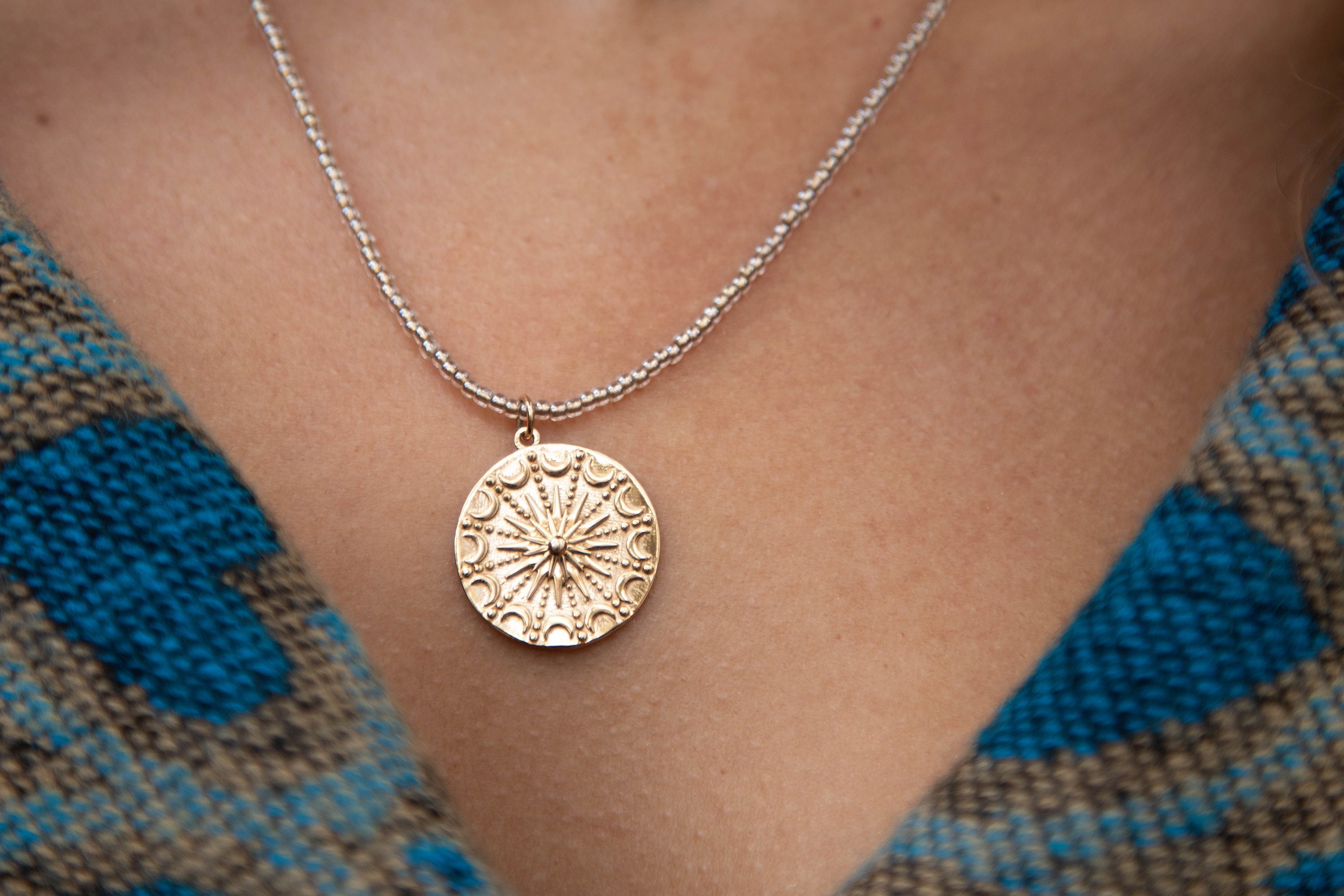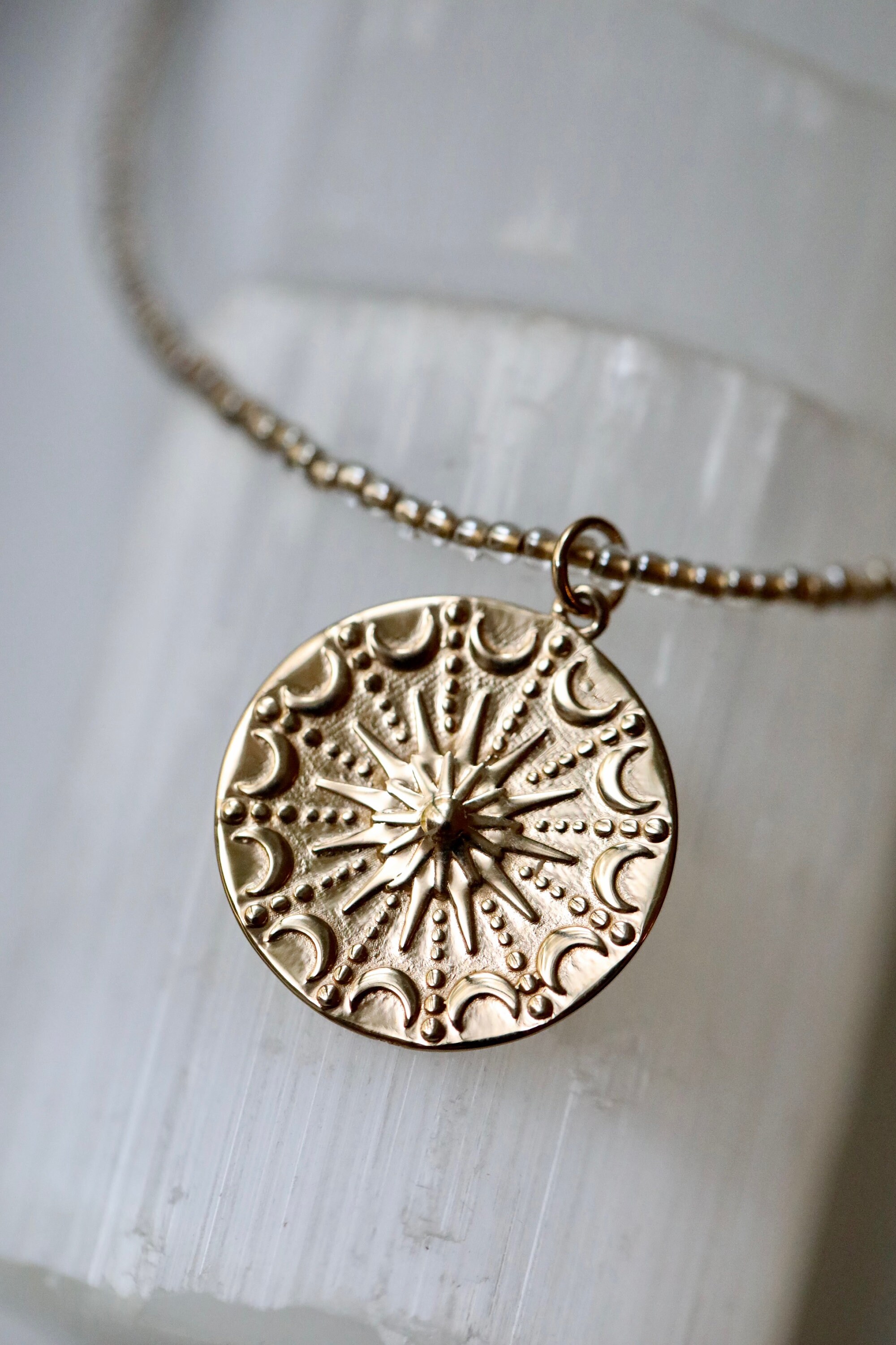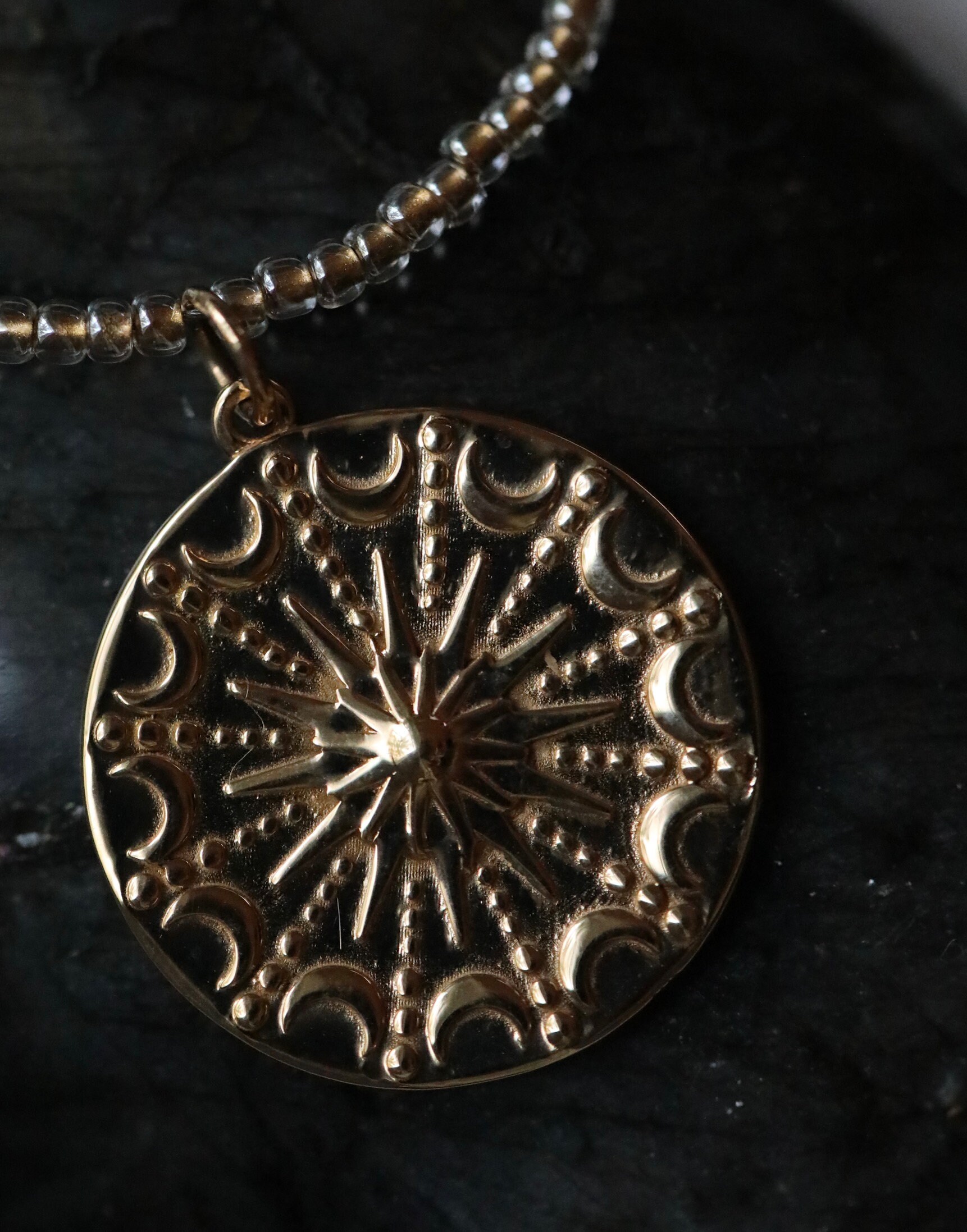 This 18" hand beaded necklace has a gorgeous Italian bronze sun + moon mandala pendant that mesmerizes with its many moons and rays of sunlight, invoking peace and solace from the heavens above. Wear it as a protective talisman, and to represent the balance between sunlight and moonlight.