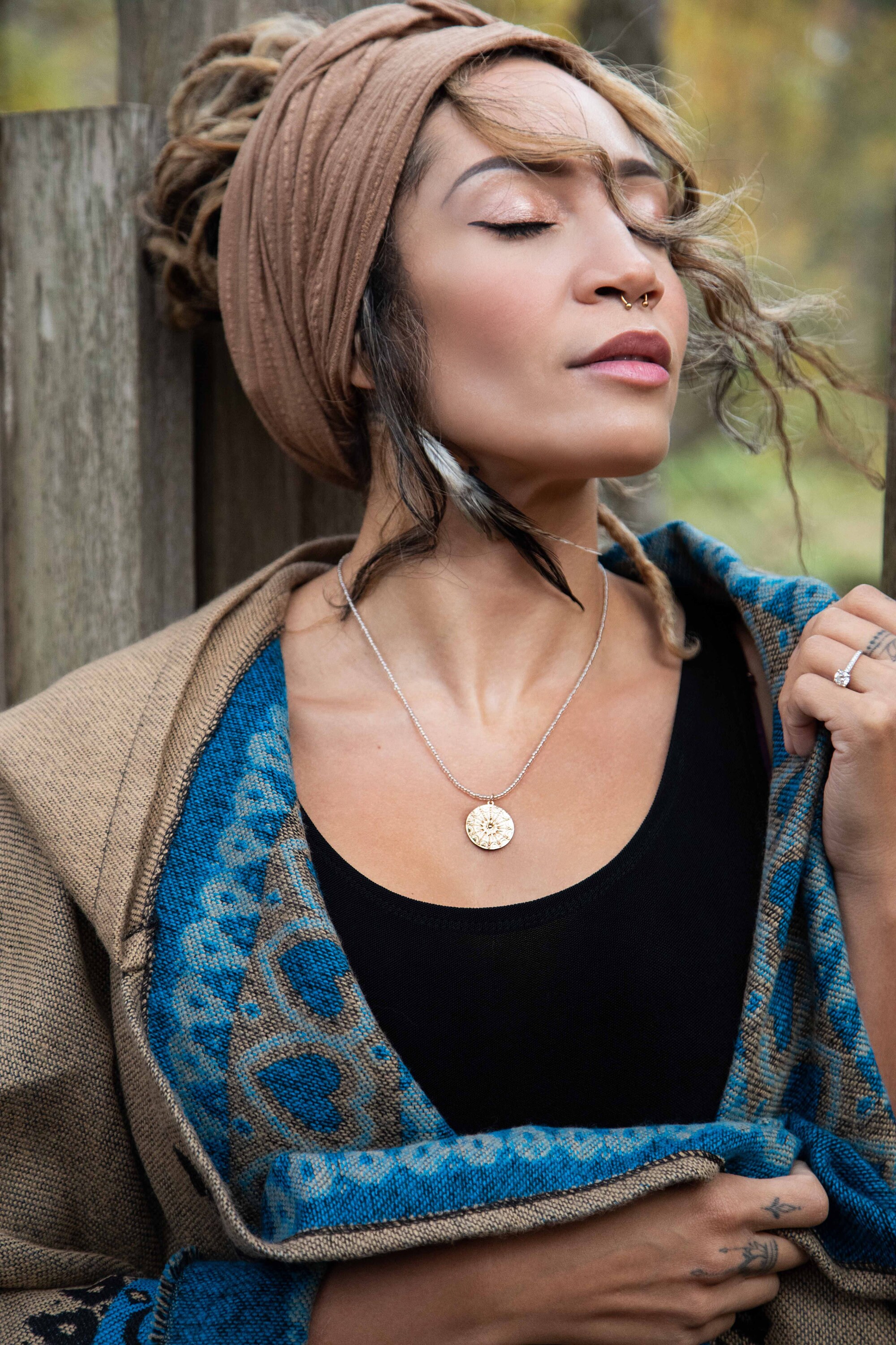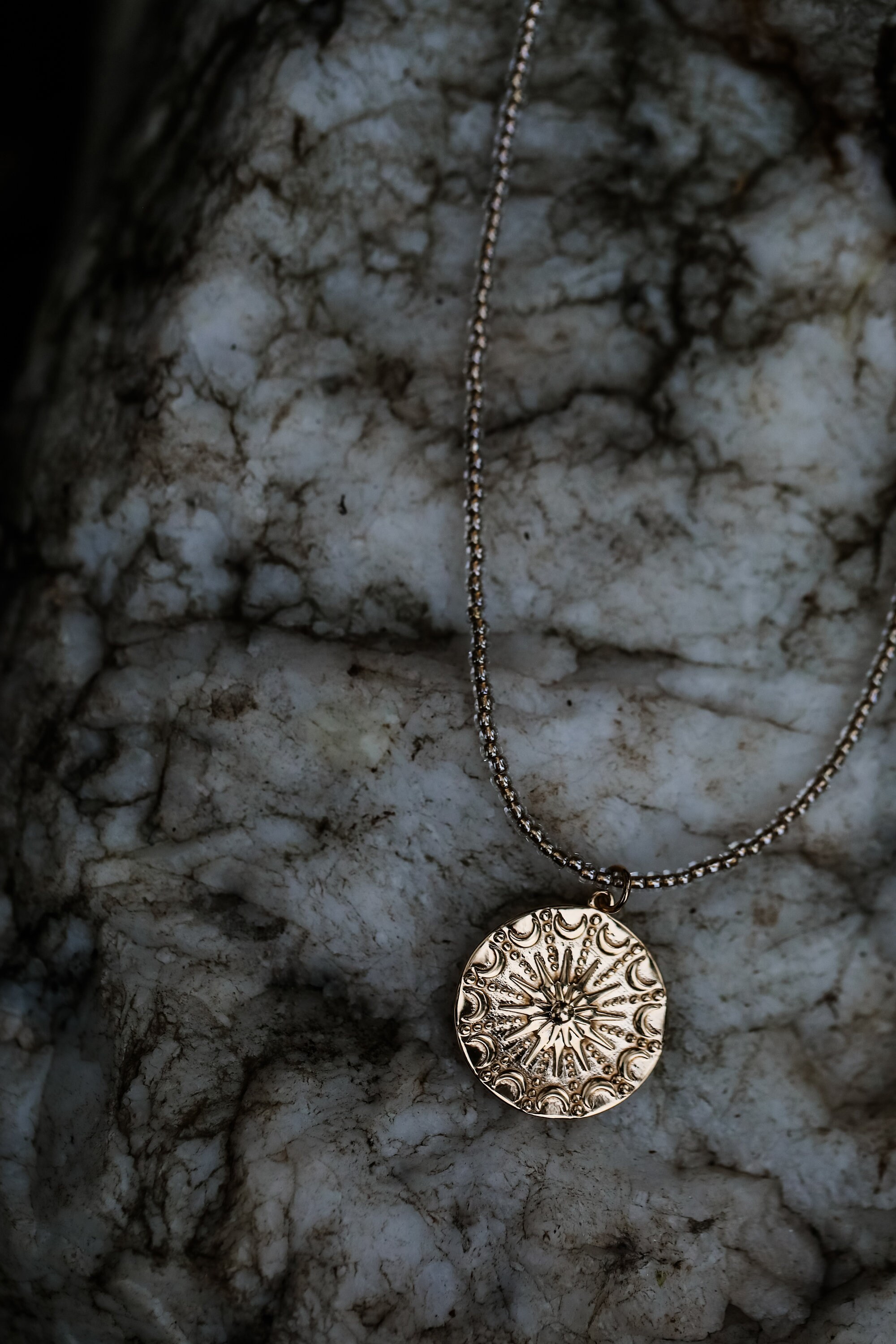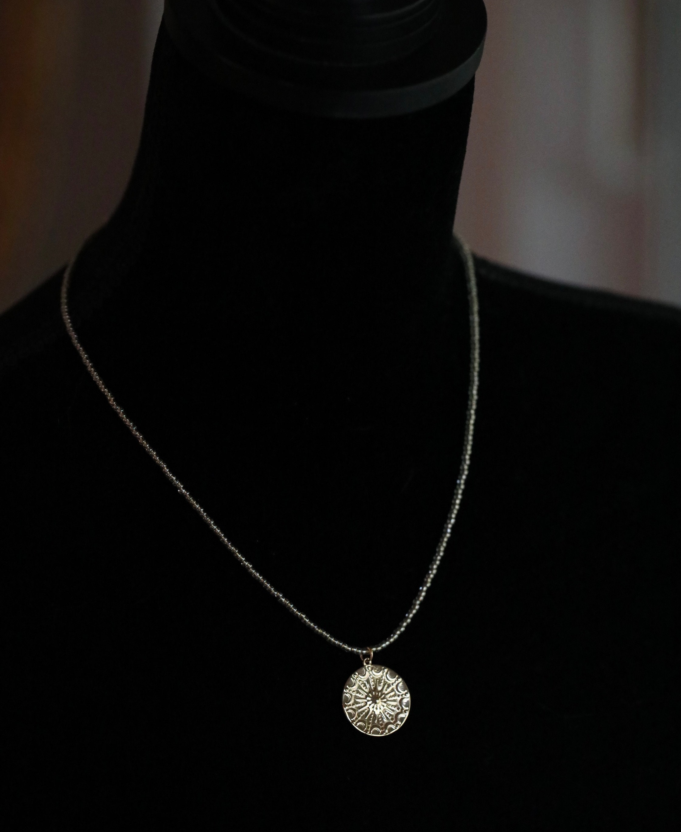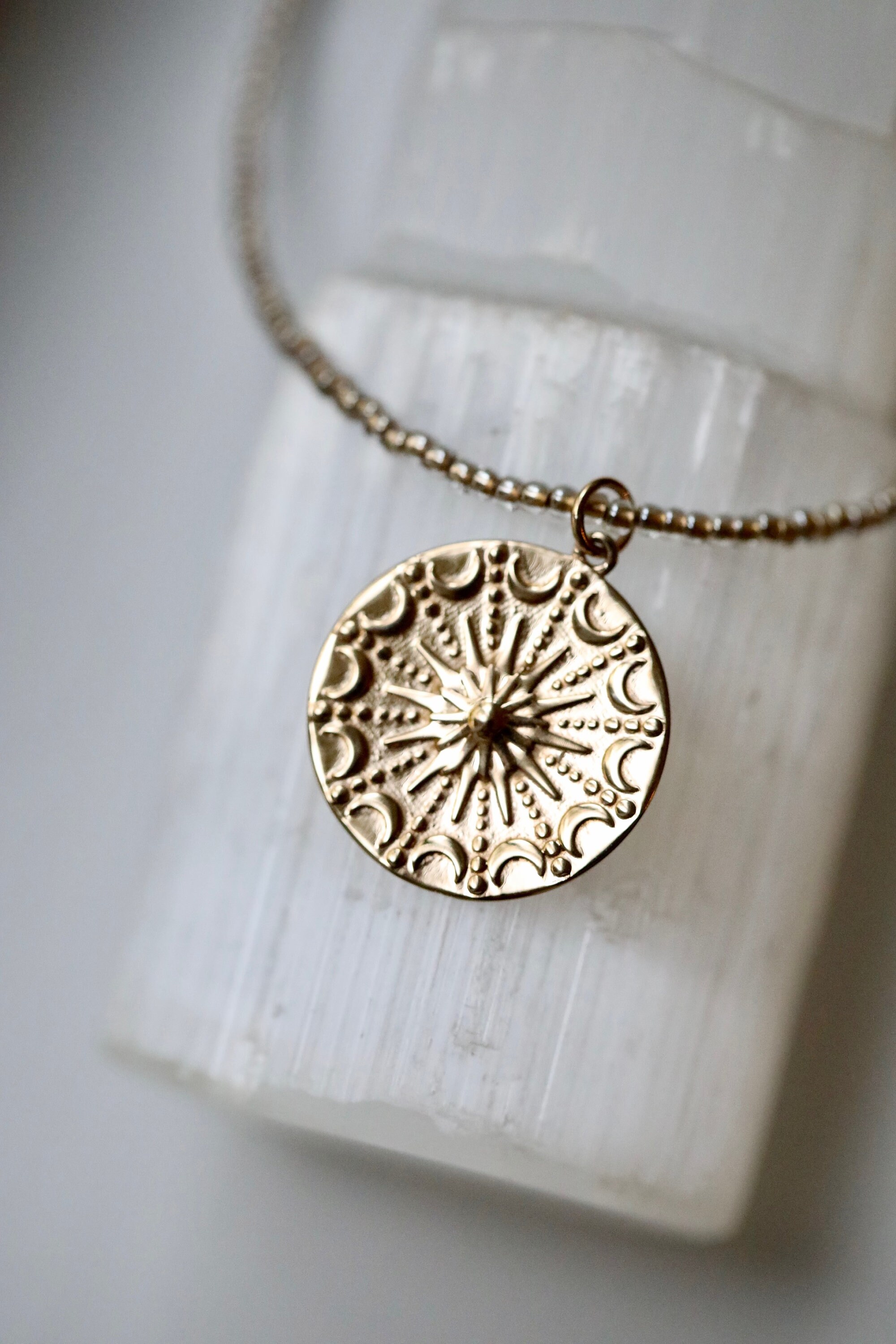 This 18" hand beaded necklace has a gorgeous Italian bronze sun + moon mandala pendant that mesmerizes with its many moons and rays of sunlight, invoking peace and solace from the heavens above. Wear it as a protective talisman, and to represent the balance between sunlight and moonlight.