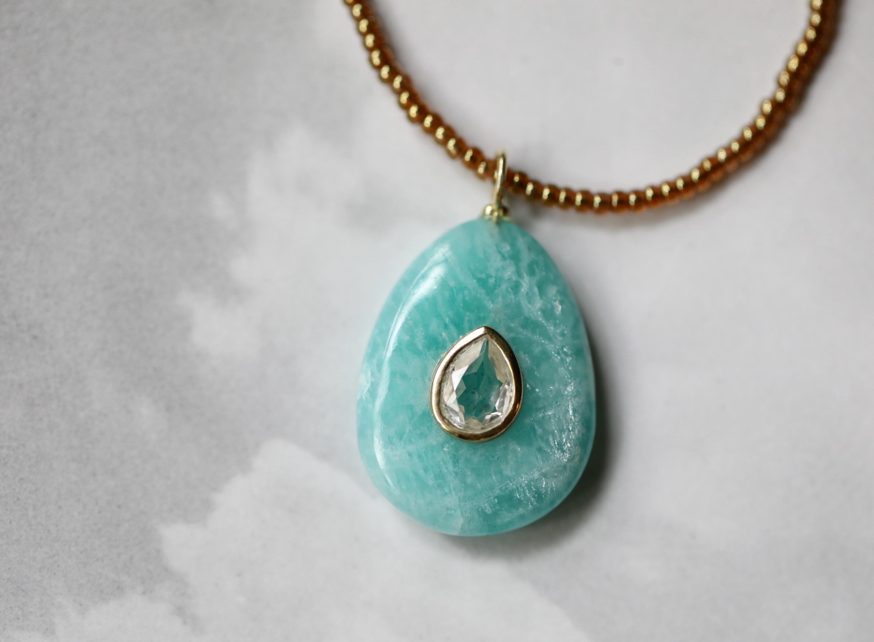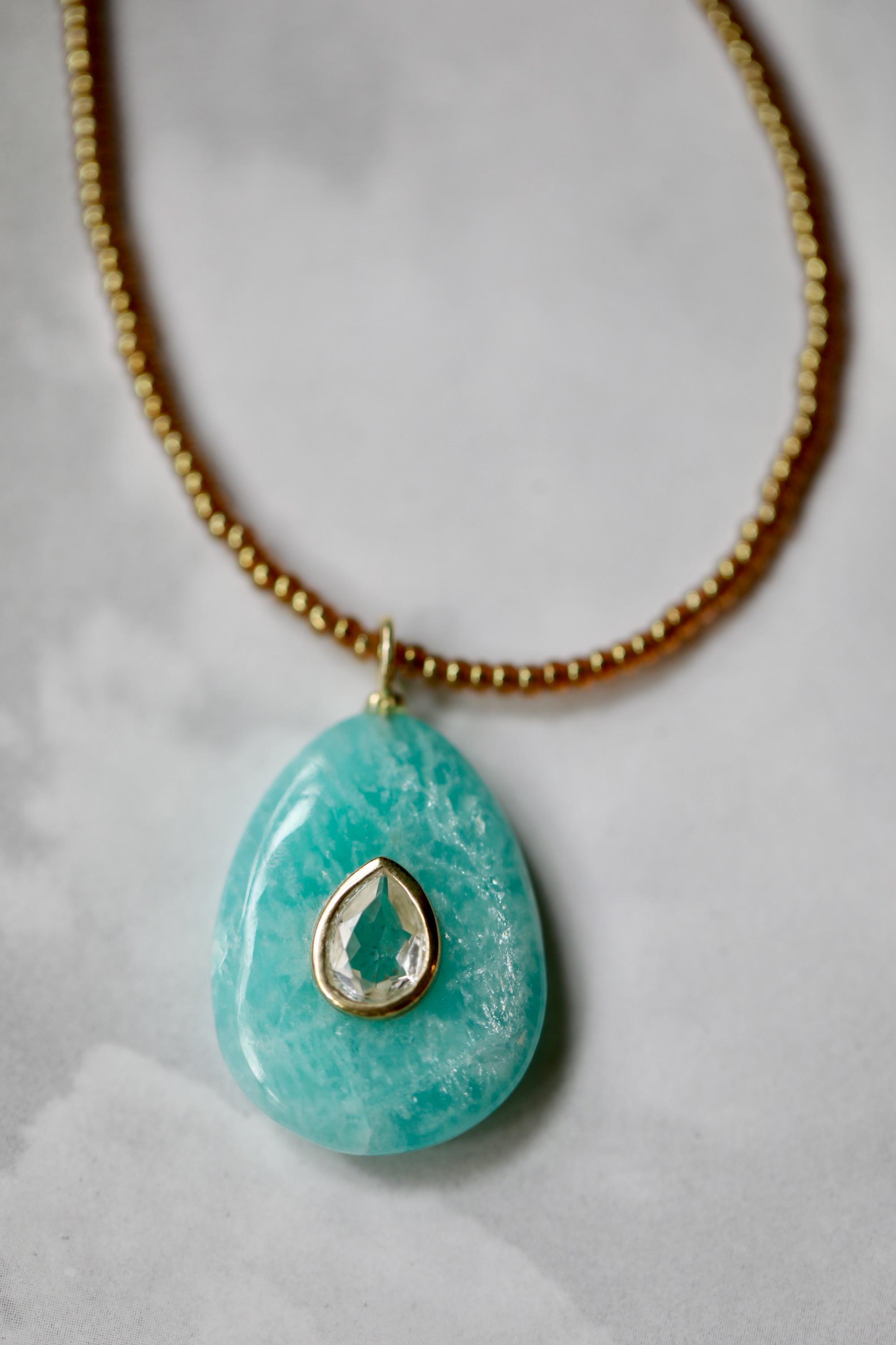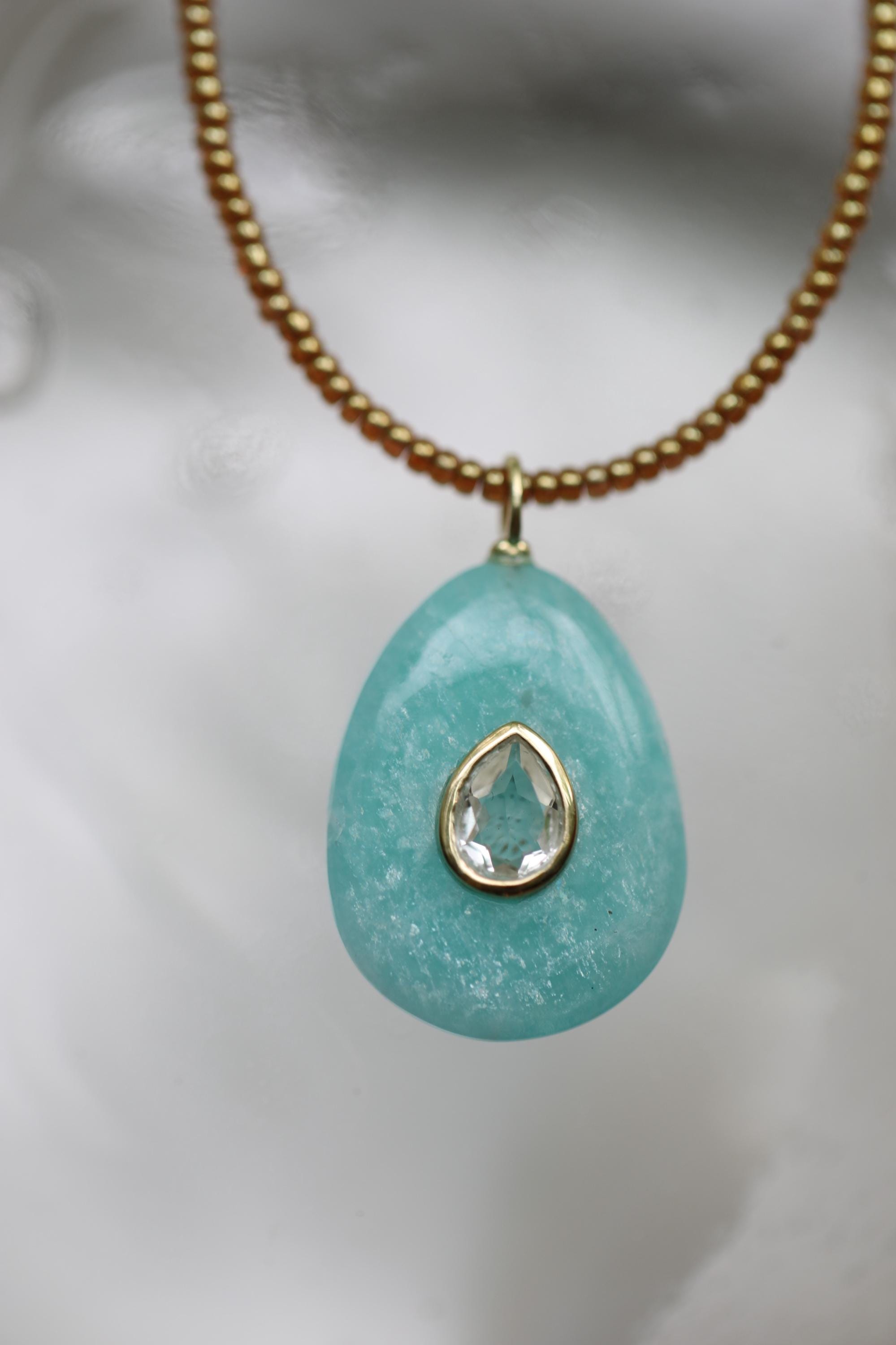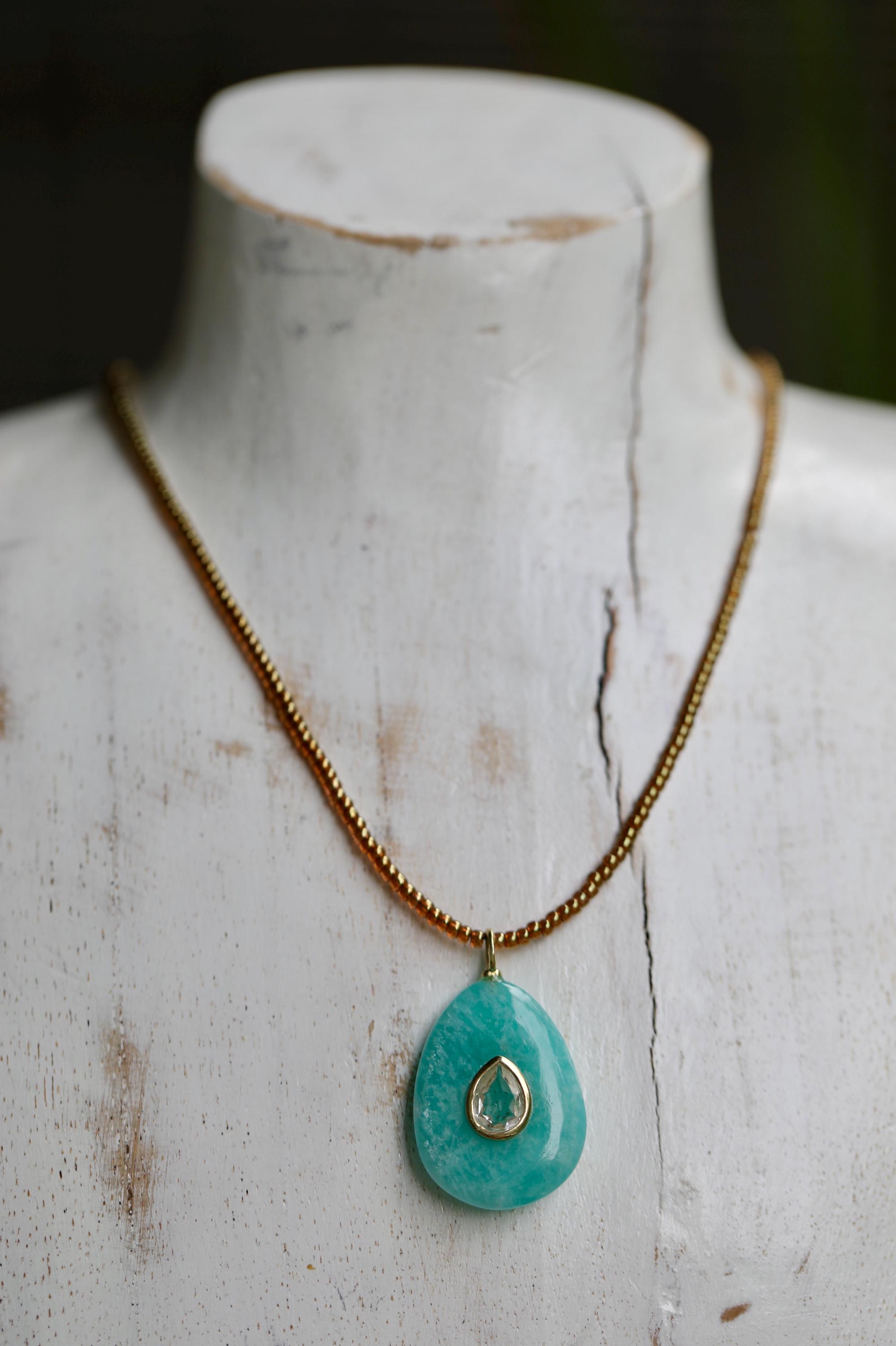 Embrace harmony, clarity, and elegance with this one-of-a-kind Amazonite necklace. A pear-shaped Amazonite stone (1.02" x .78") is inlaid with a sparkling White Topaz, framed in a sterling silver bezel and bail plated with luminous gold. Strung with honey-colored premium Japanese glass beads, this 18" necklace is finished with a gold-filled lobster clasp and extender chain for a touch of timeless refinement.