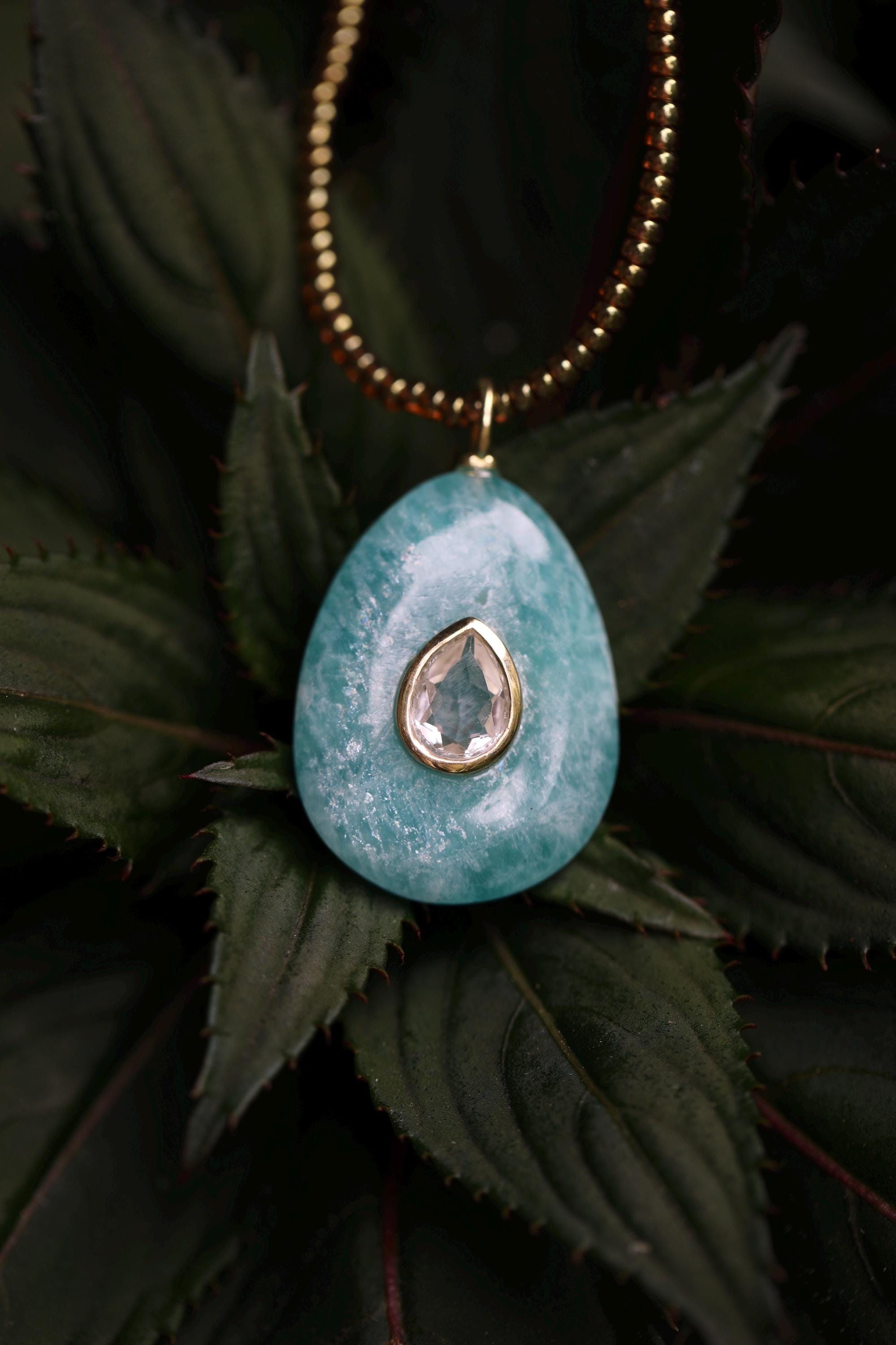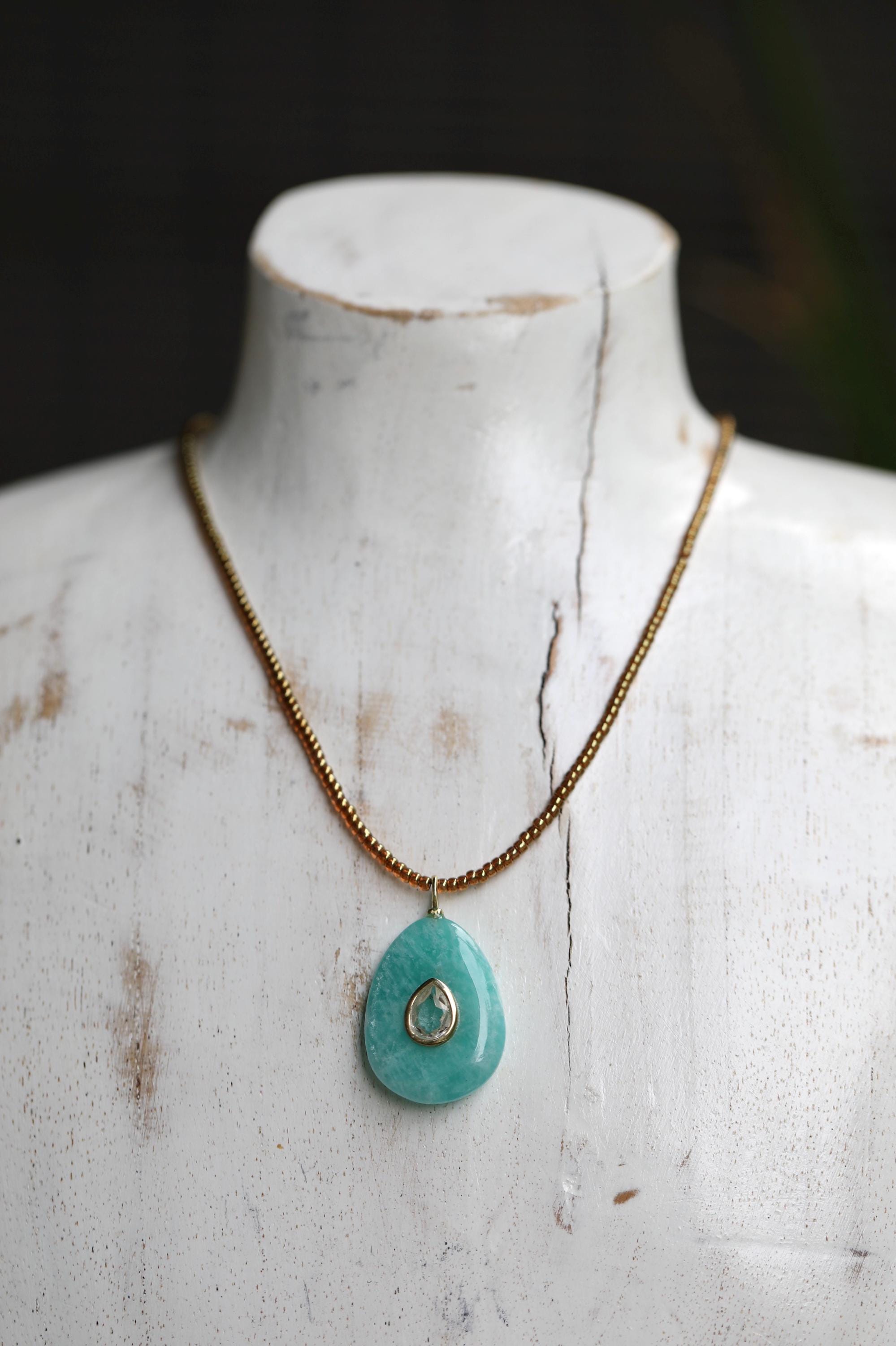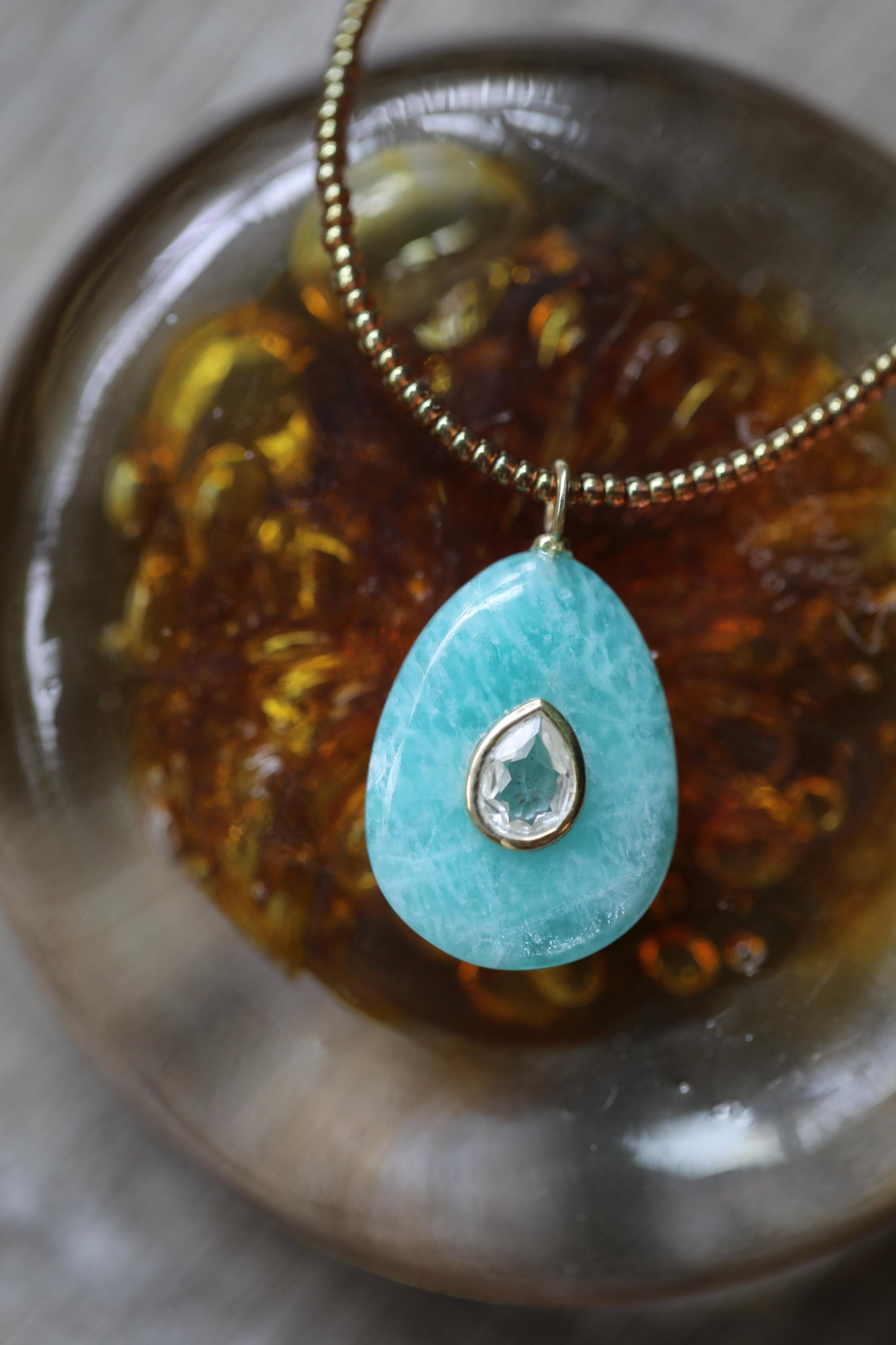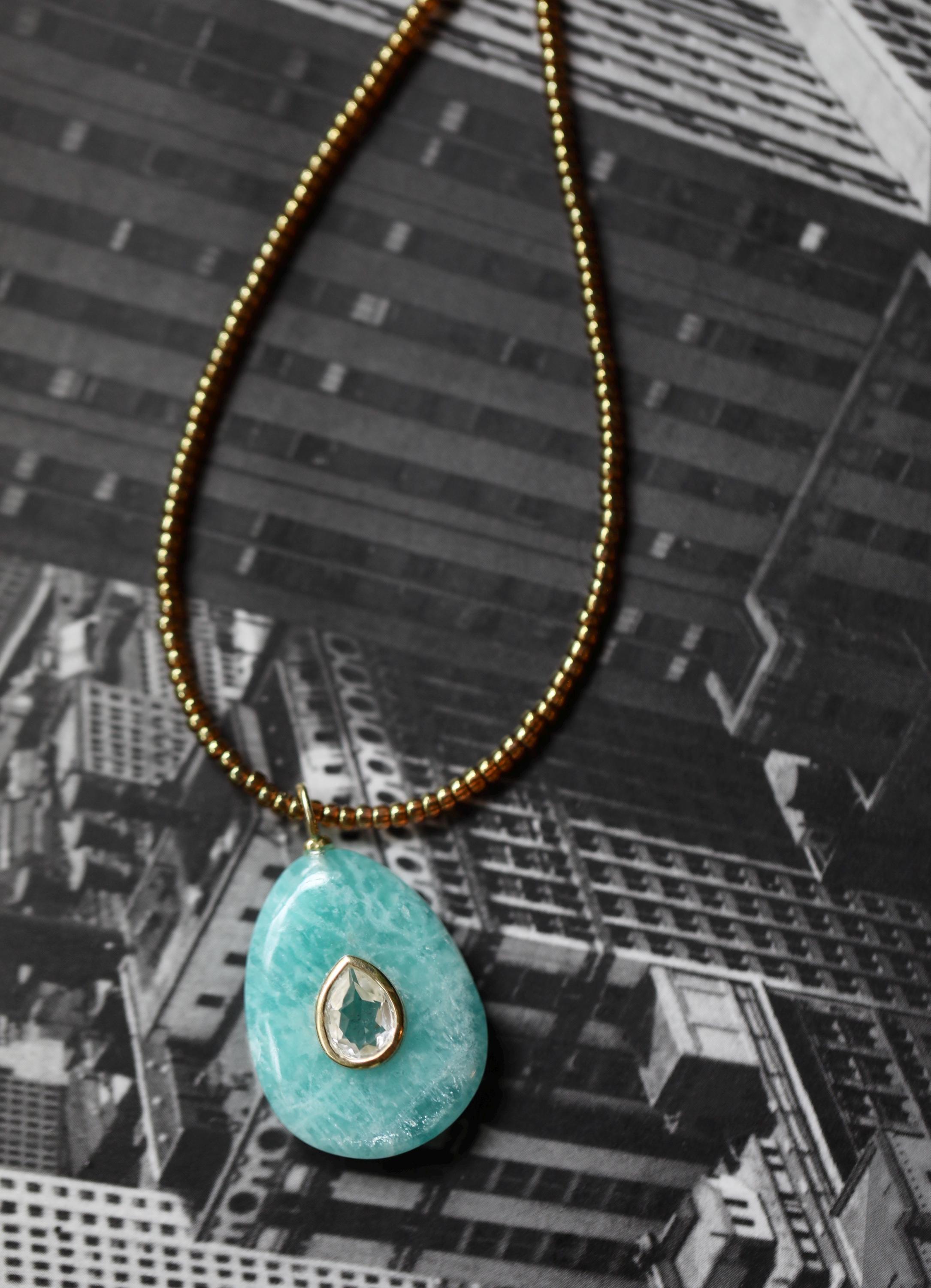 Embrace harmony, clarity, and elegance with this one-of-a-kind Amazonite necklace. A pear-shaped Amazonite stone (1.02" x .78") is inlaid with a sparkling White Topaz, framed in a sterling silver bezel and bail plated with luminous gold. Strung with honey-colored premium Japanese glass beads, this 18" necklace is finished with a gold-filled lobster clasp and extender chain for a touch of timeless refinement.