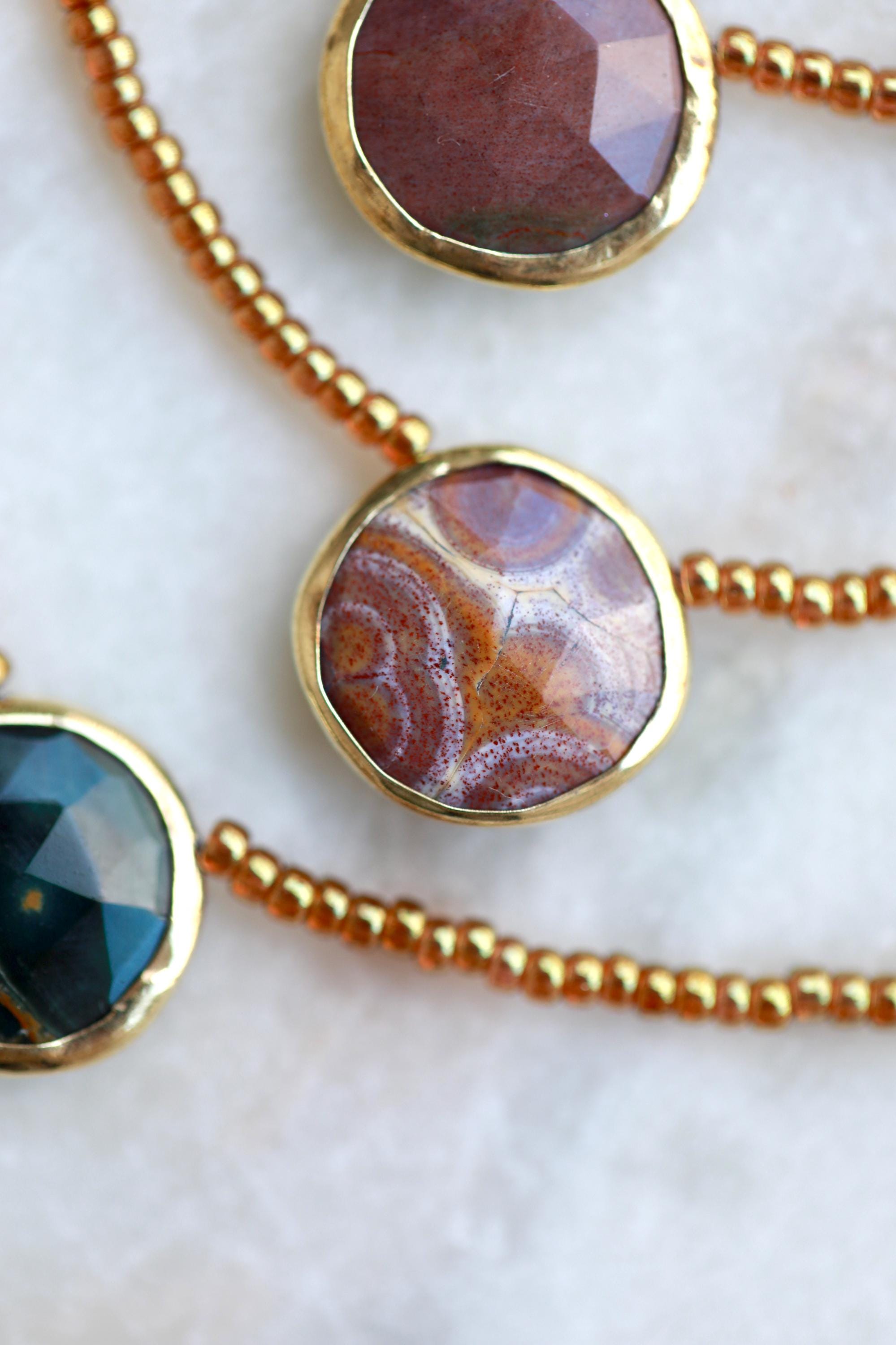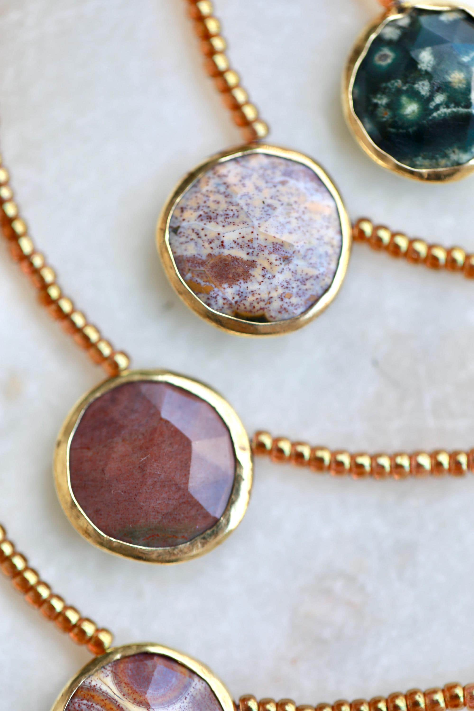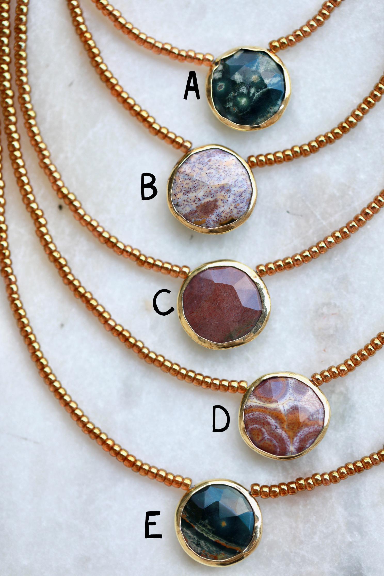 🌊 Like waves meeting the shore, these Ocean Jasper coin pendant necklaces bring calm, balance, and beauty to your everyday. A single polished ocean jasper—each with its own mesmerizing pattern of colors—are framed in a sterling silver bezel with gold plating, and strung on Japanese glass beads. Gold filled lobster clasp and extender chain for adjustable comfort.