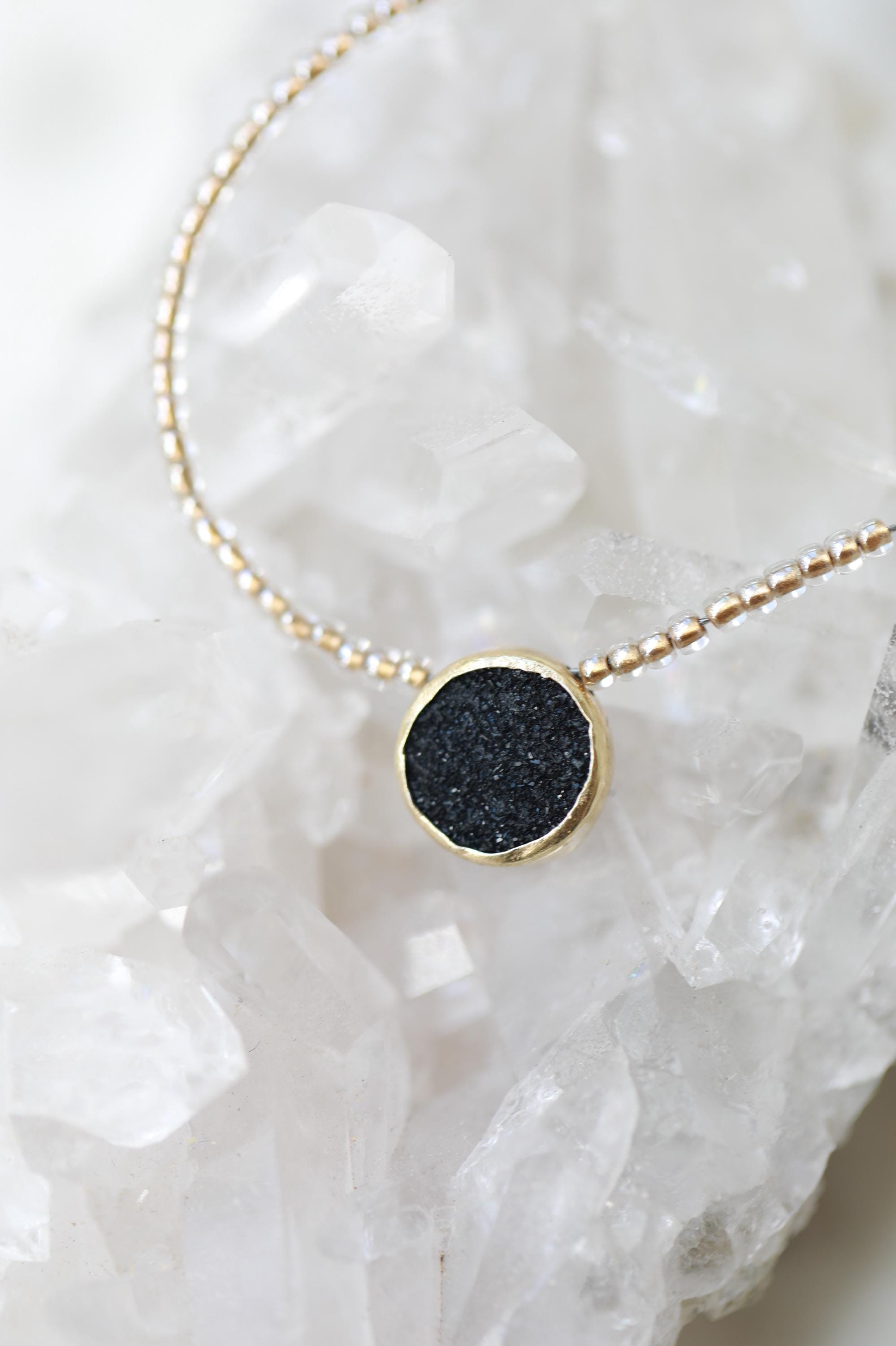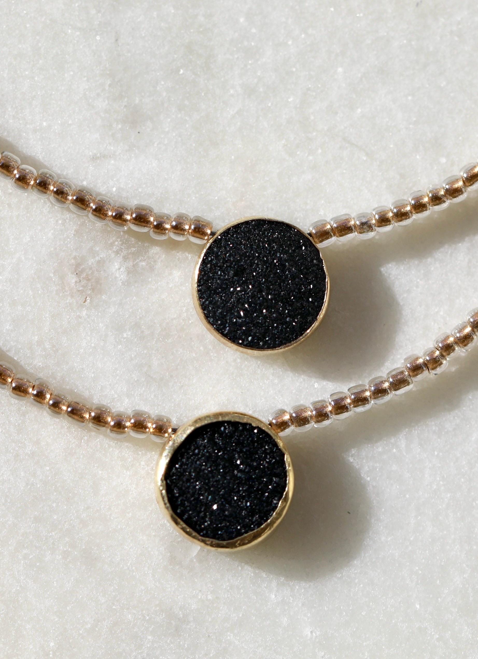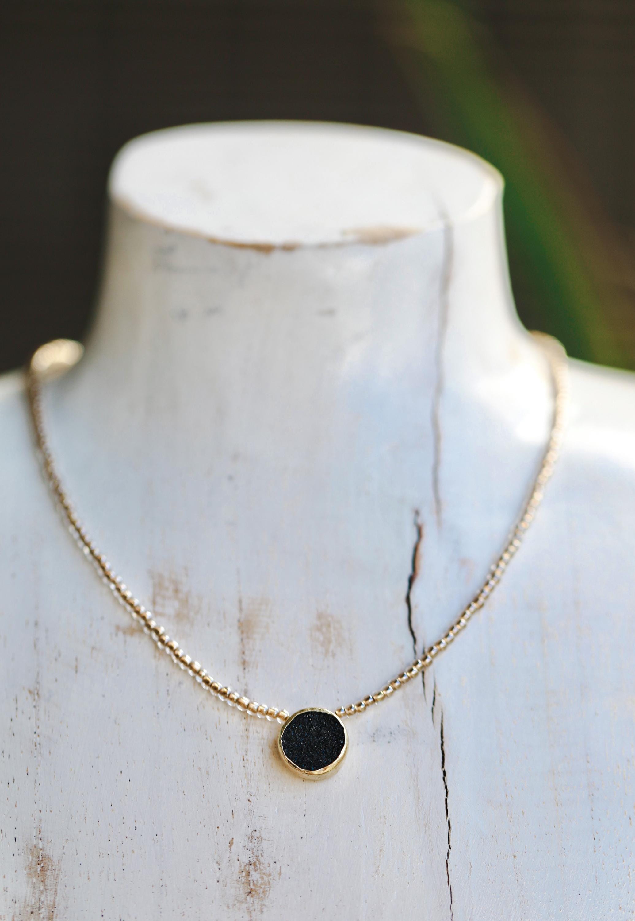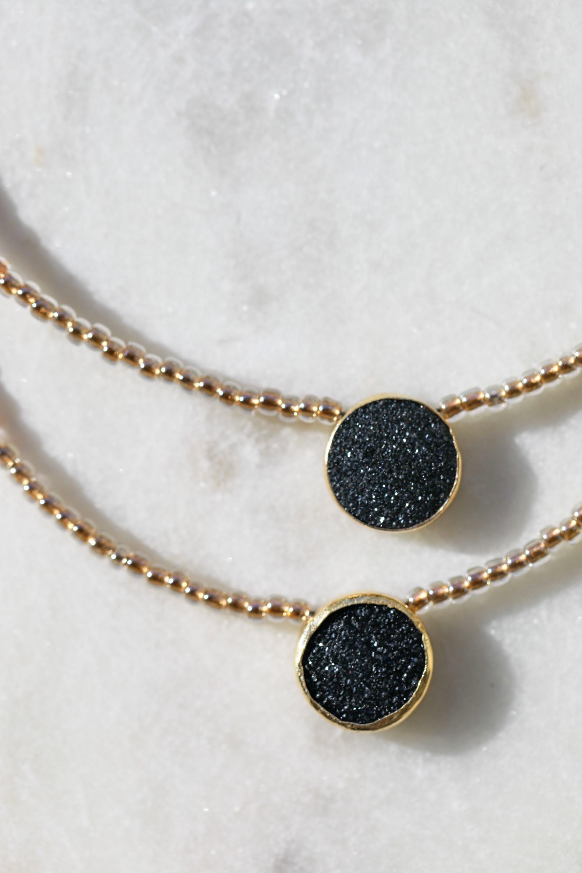 A captivating 16" necklace featuring a natural black druzy gemstone. Hand-beaded with gold-lined glass for that subtle sparkle — and yes, she layers like a dream.