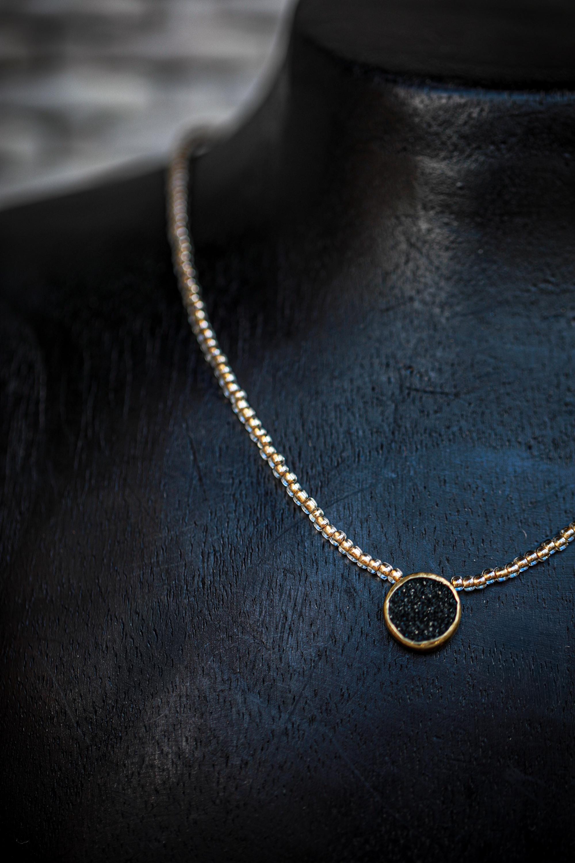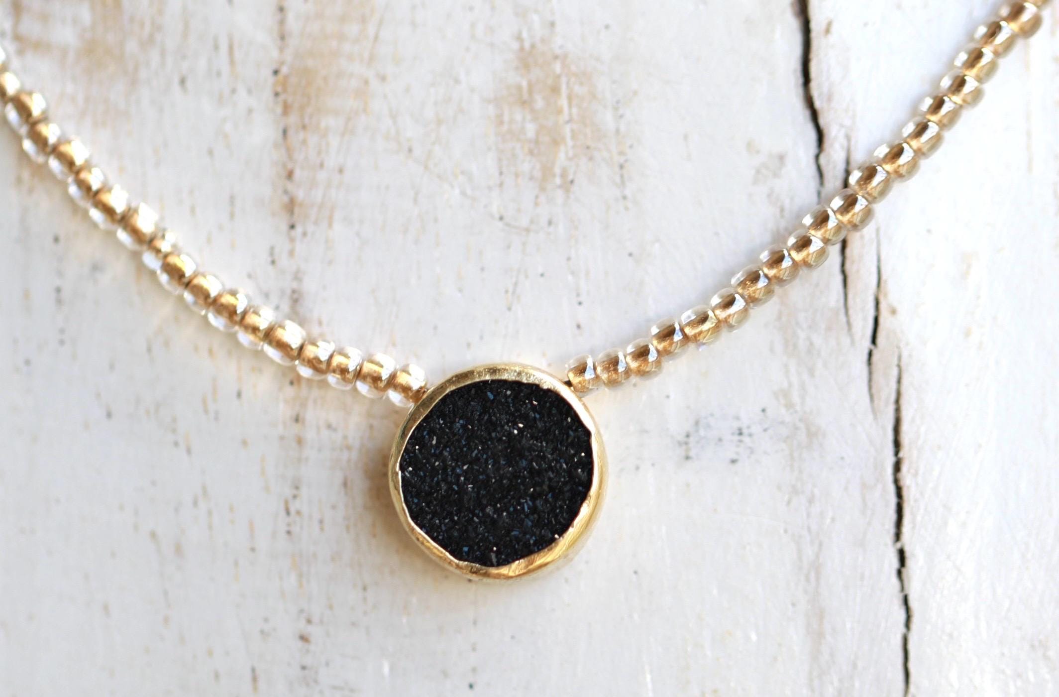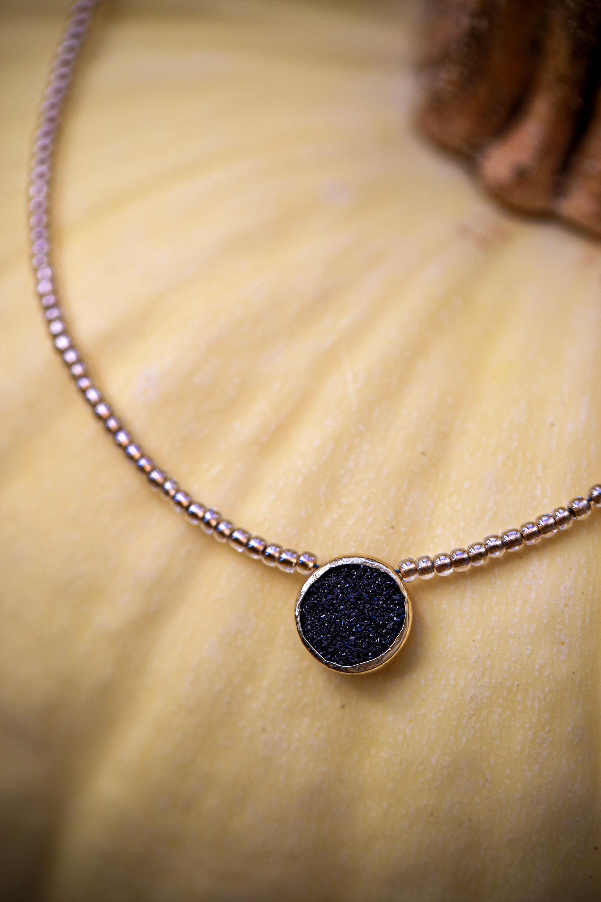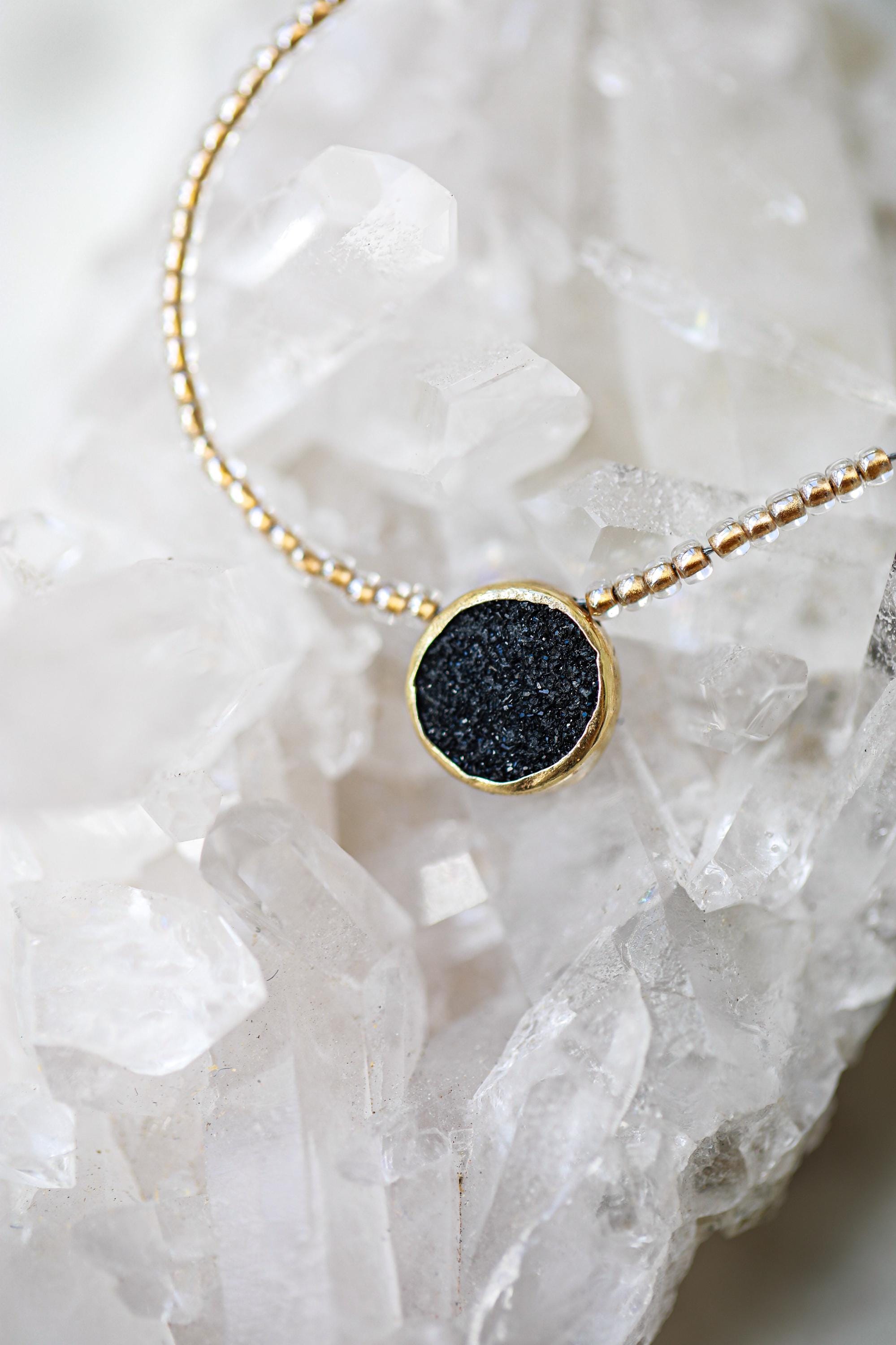 A captivating 16" necklace featuring a natural black druzy gemstone. Hand-beaded with gold-lined glass for that subtle sparkle — and yes, she layers like a dream.