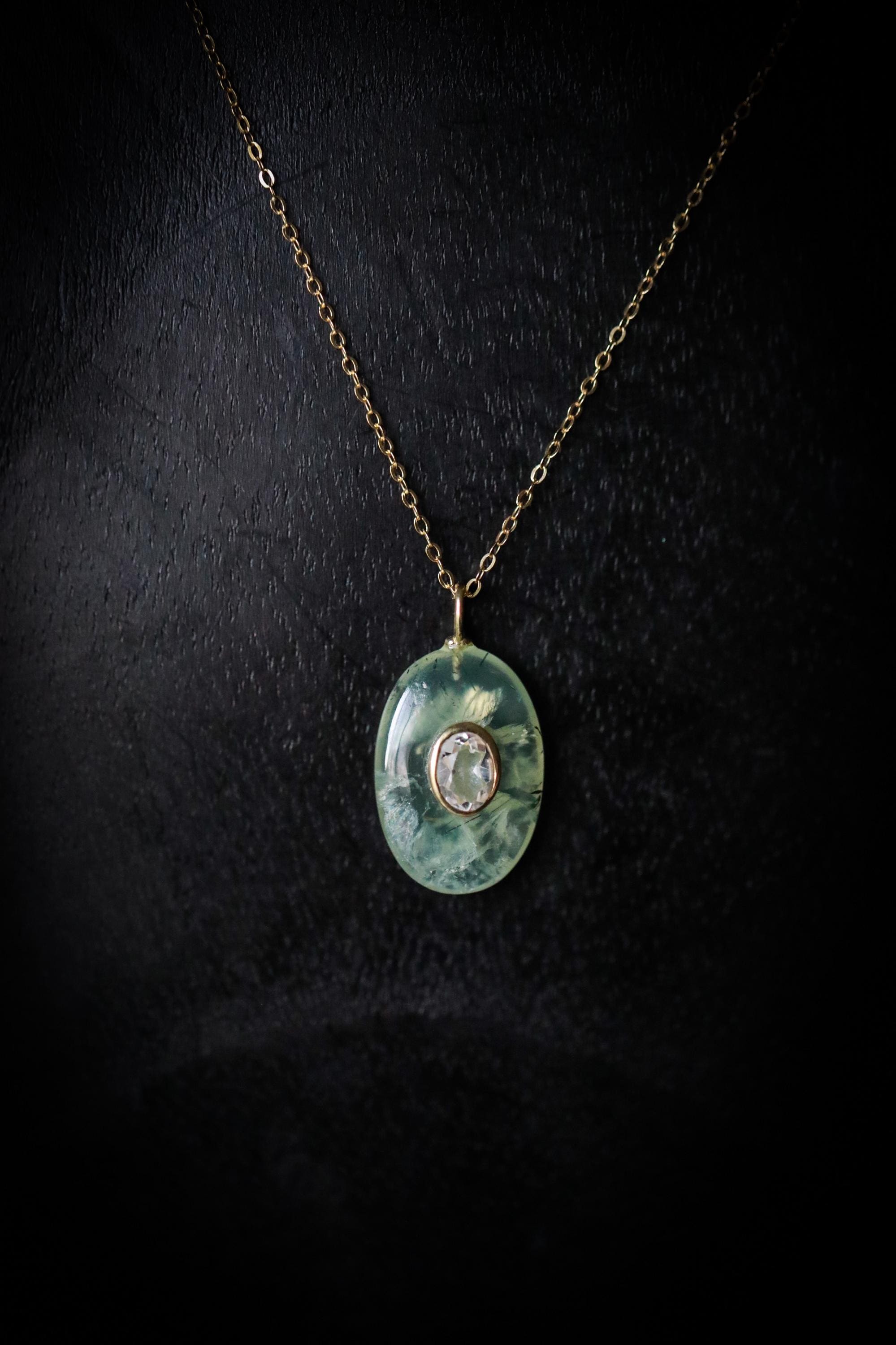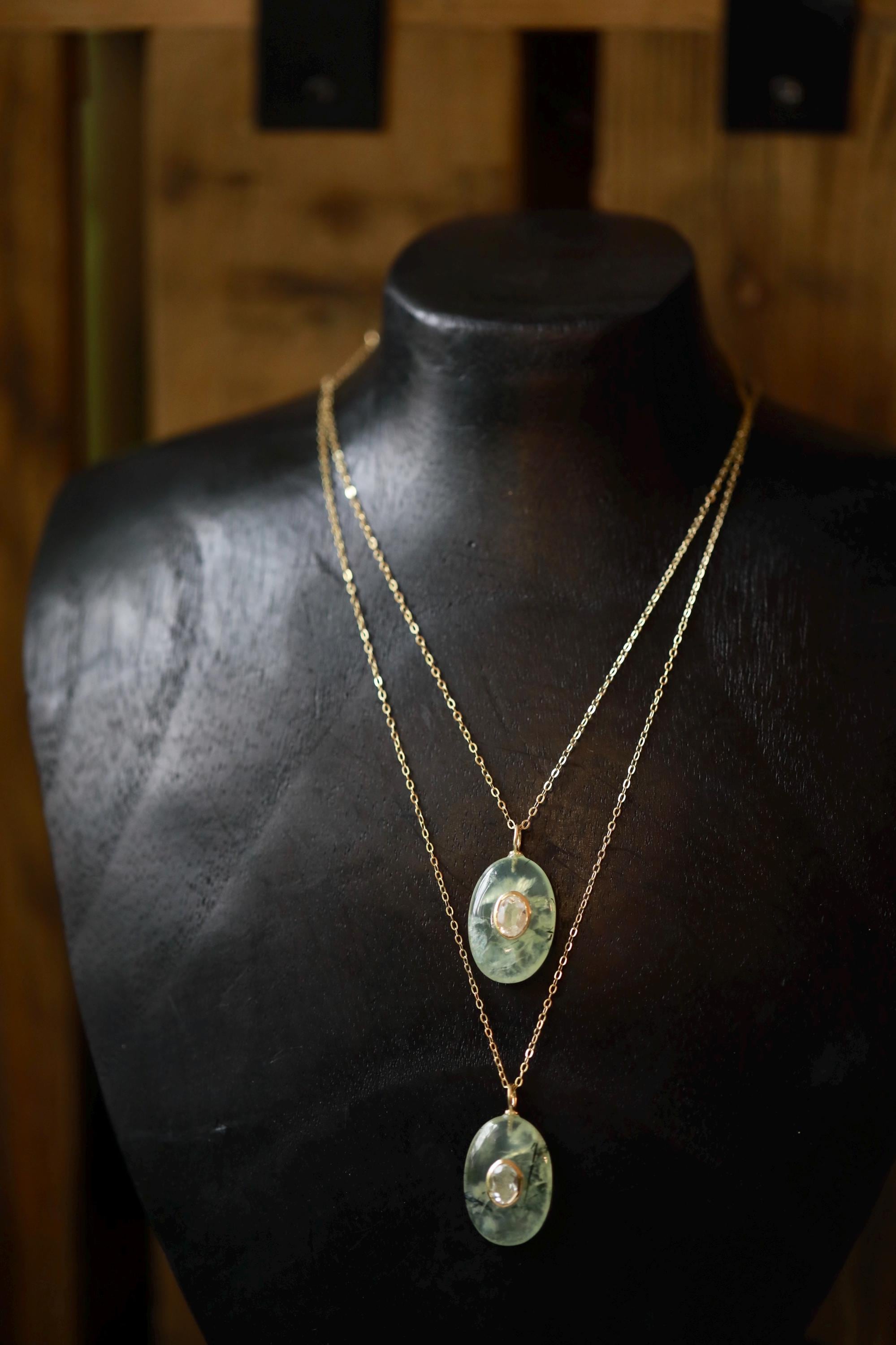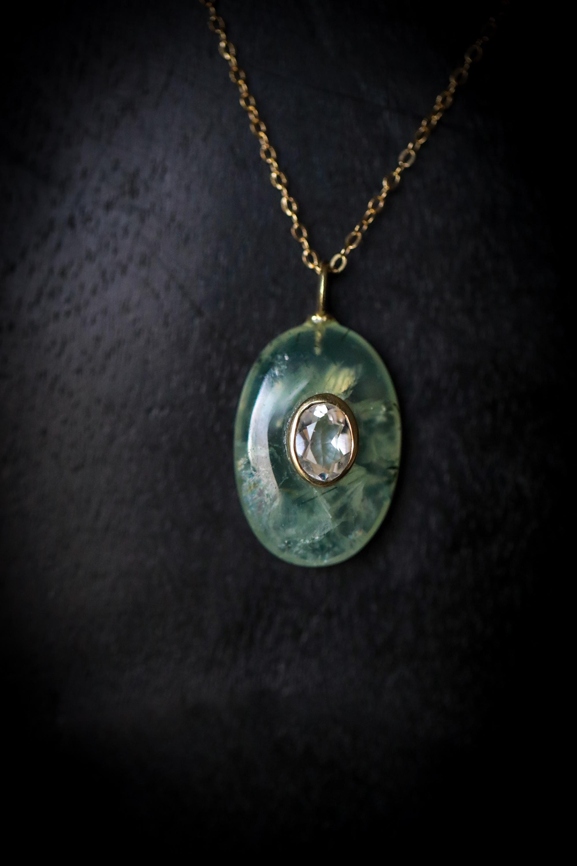 👋🏻Meet your new statement piece — a stunning Prehnite gemstone inlaid with White Topaz (approx. .86" x .61", set in an elegant oval sterling silver bezel with gold plating). Each pendant is completely one-of-a-kind, showcasing its own natural inclusions, soft green hues, and shimmering clarity. No two will ever be the same.