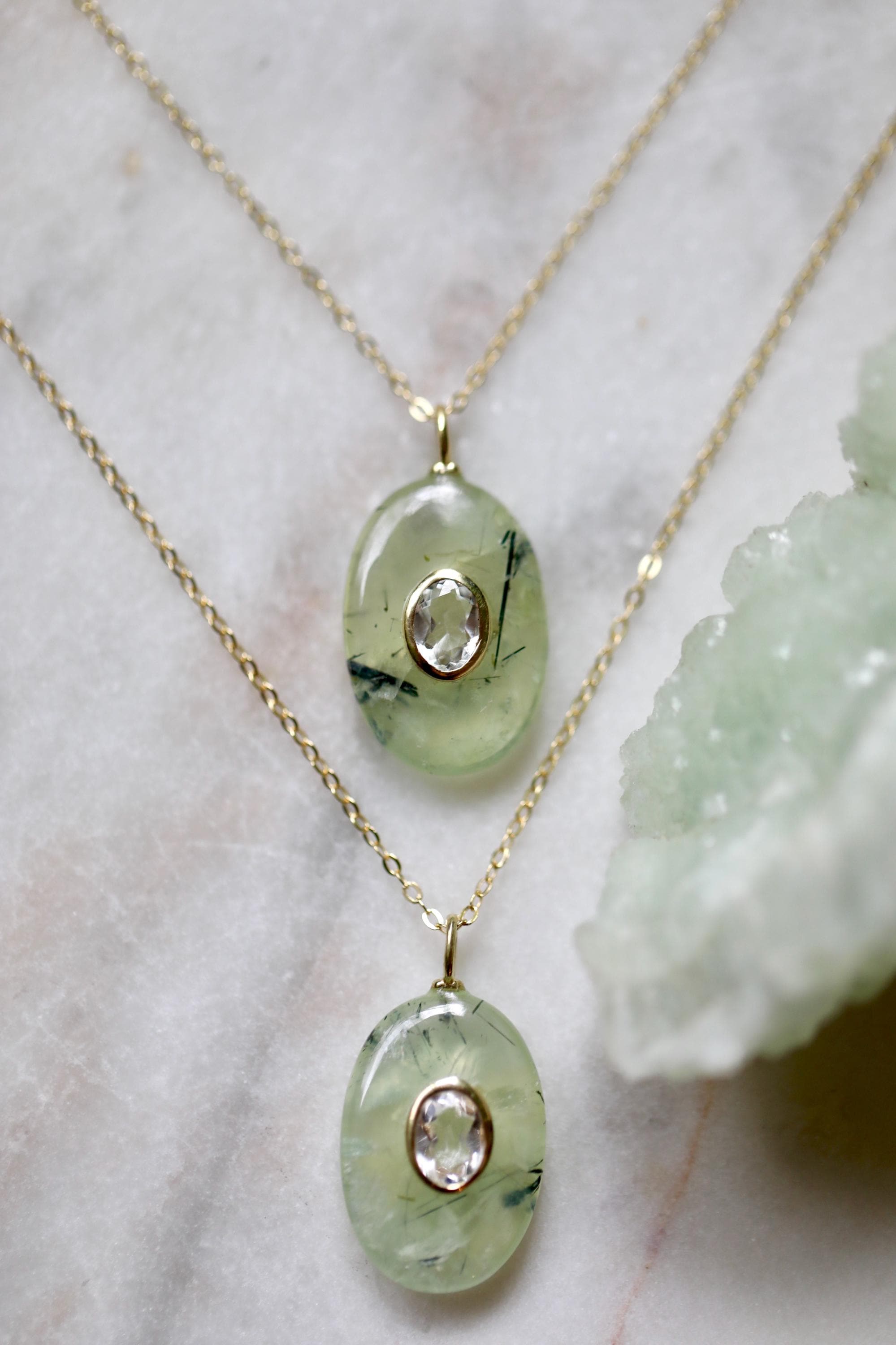 Your necklace will look similar to the photos, but each Prehnite stone is naturally unique — different hues, different inclusions, different personality. That’s the magic.