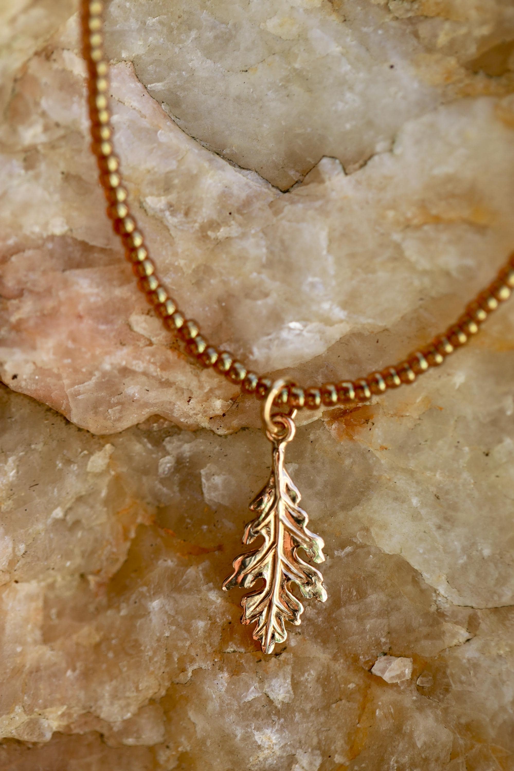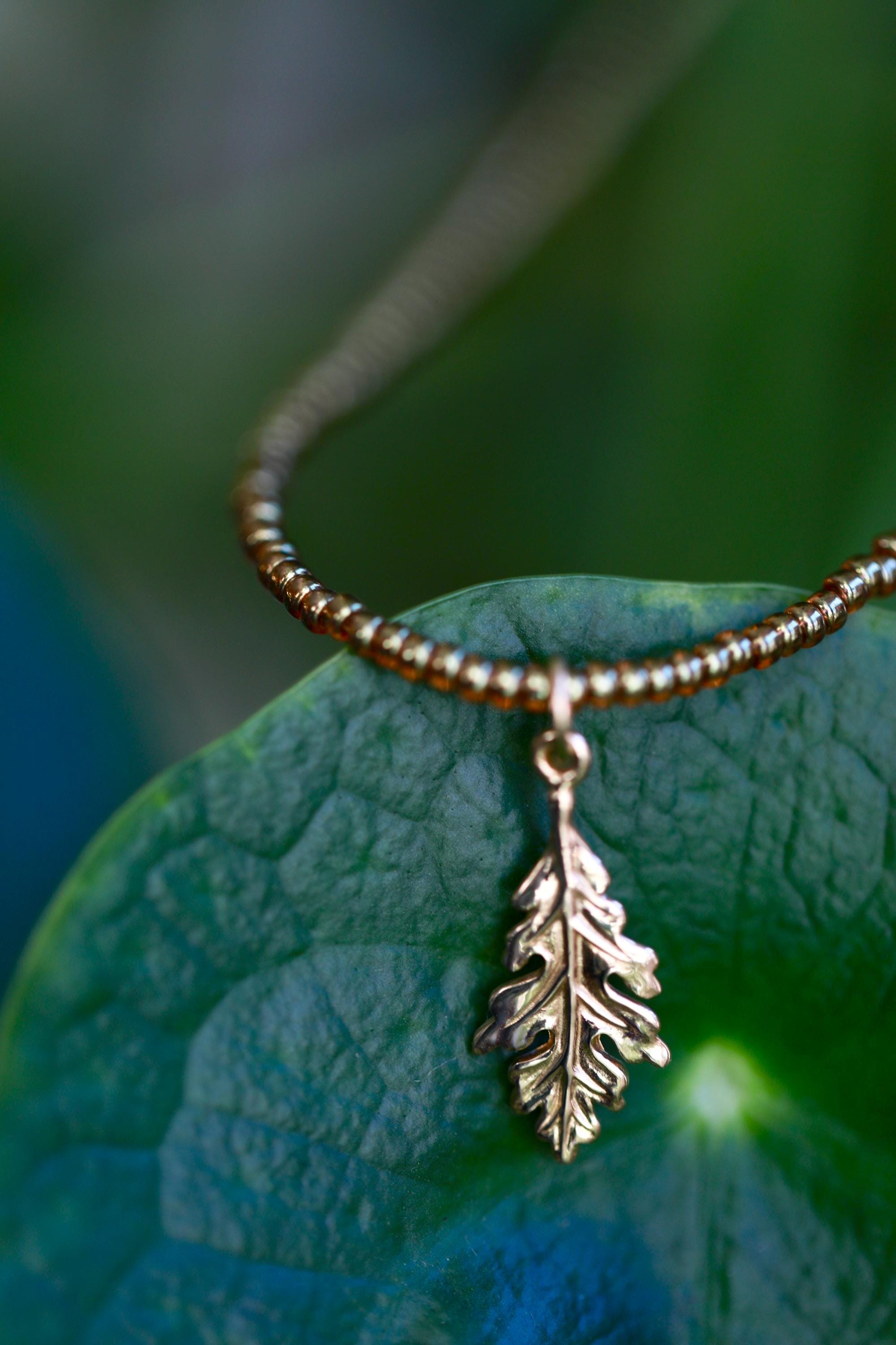 Celebrate strength, nature, and quiet elegance with this handcrafted oak leaf charm necklace. A beautifully detailed Italian Bronze oak leaf sits at the center, strung on shimmering honey-gold Japanese glass beads that catch the light with every movement.