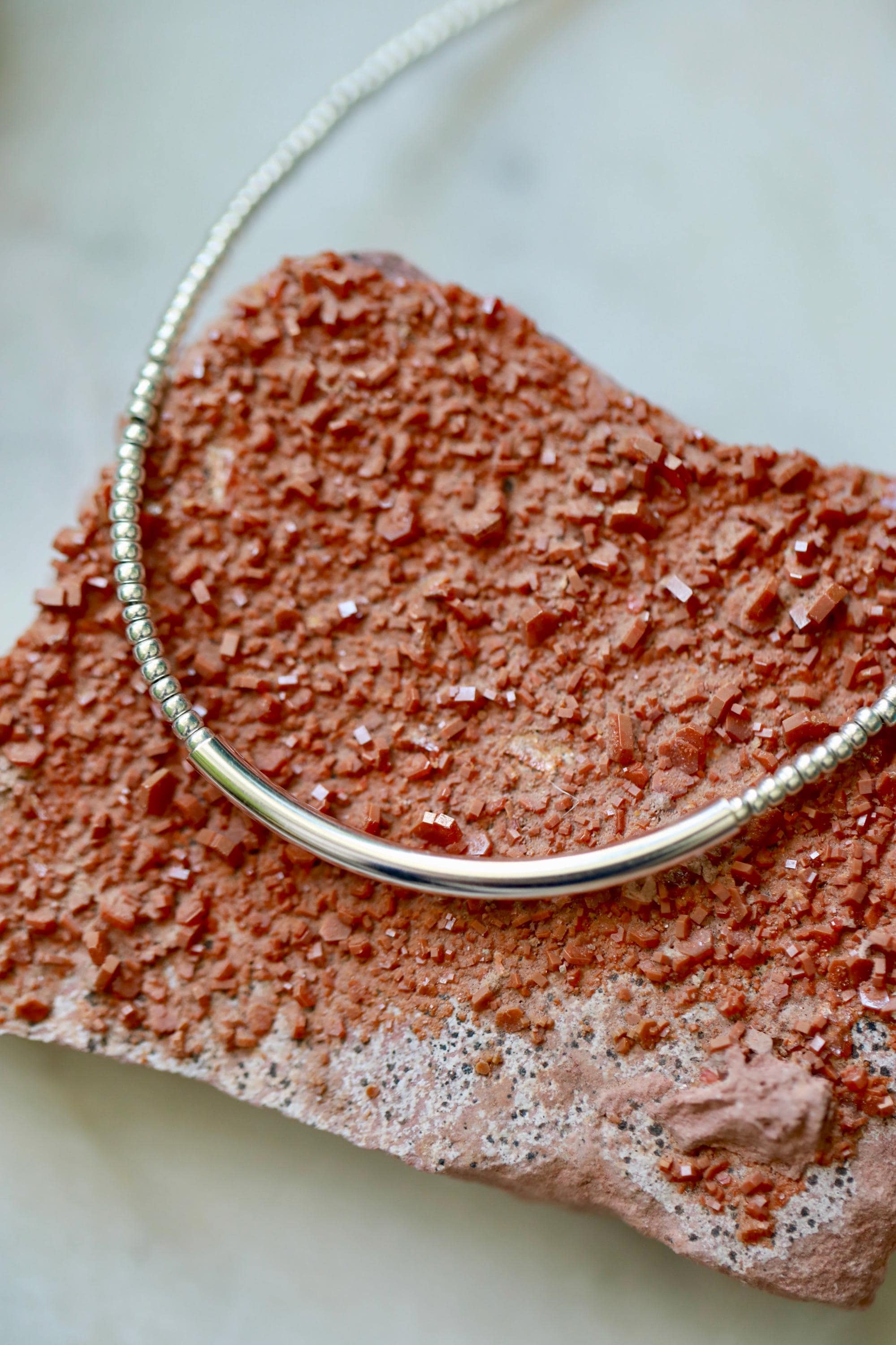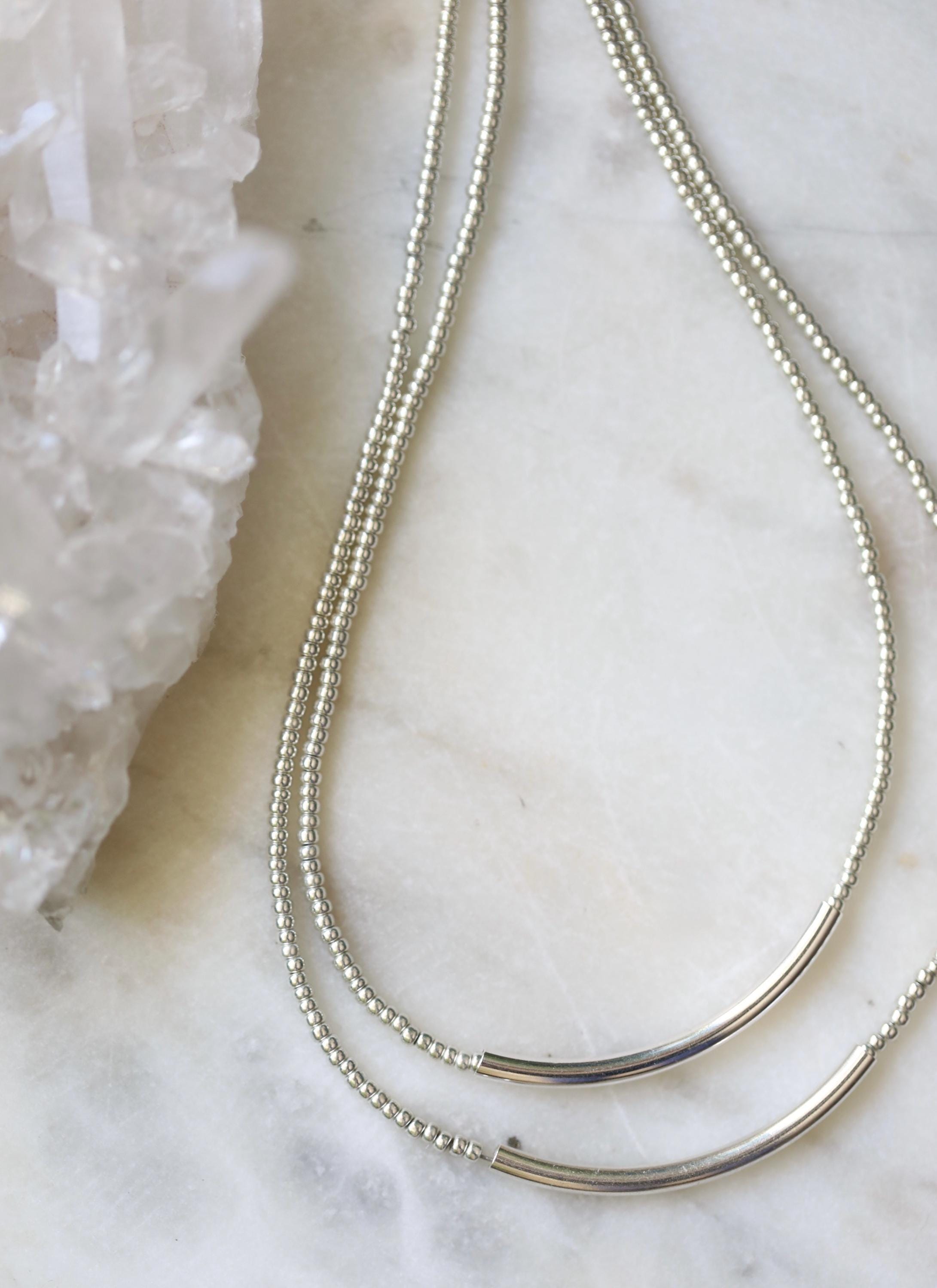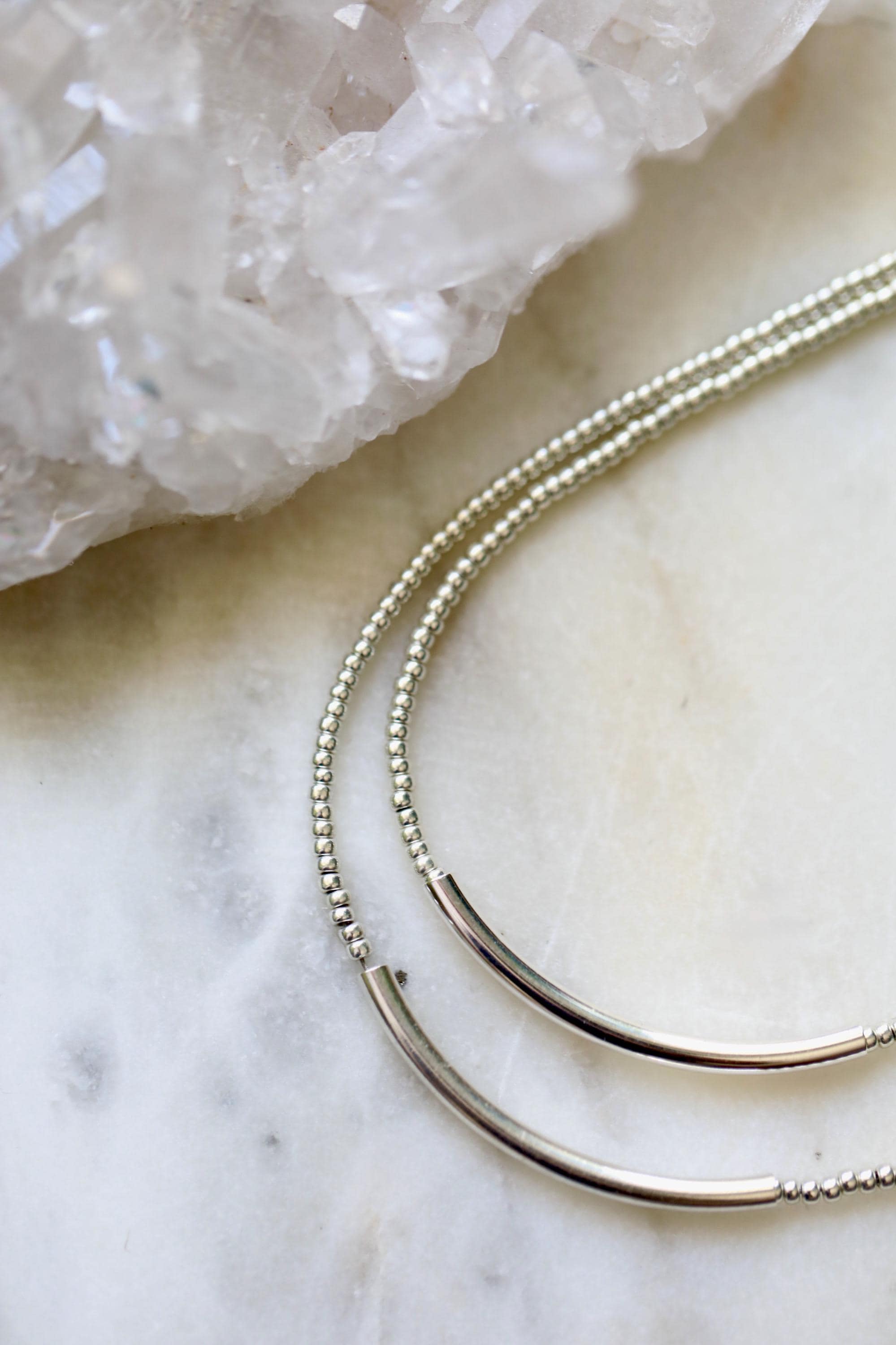 Meet your new everyday favorite. This minimalist sterling silver curved tube necklace is the perfect blend of simple elegance and effortless style. Designed to sit beautifully at 16", it layers like a dream with your longer pieces—or shines all on its own.