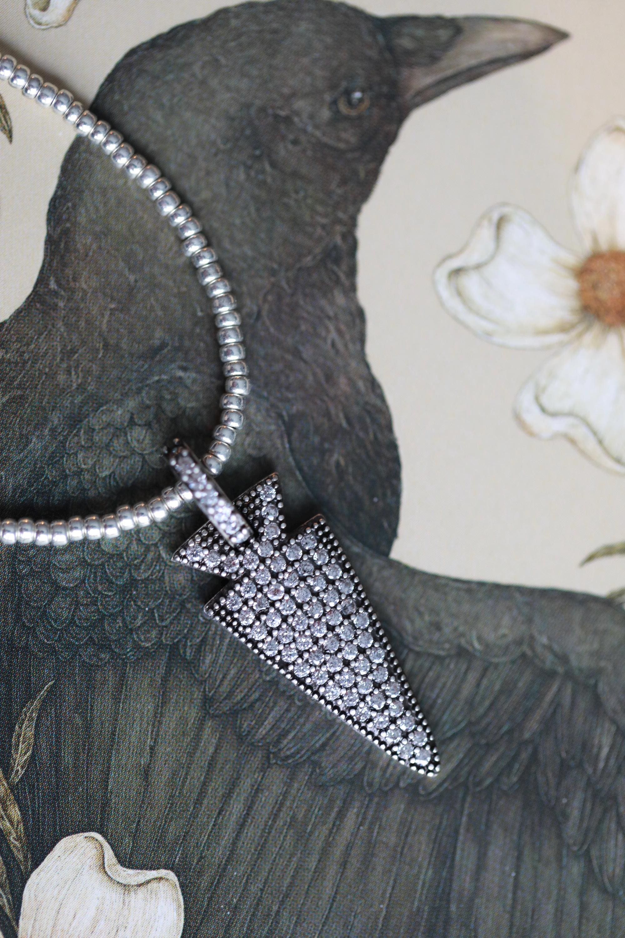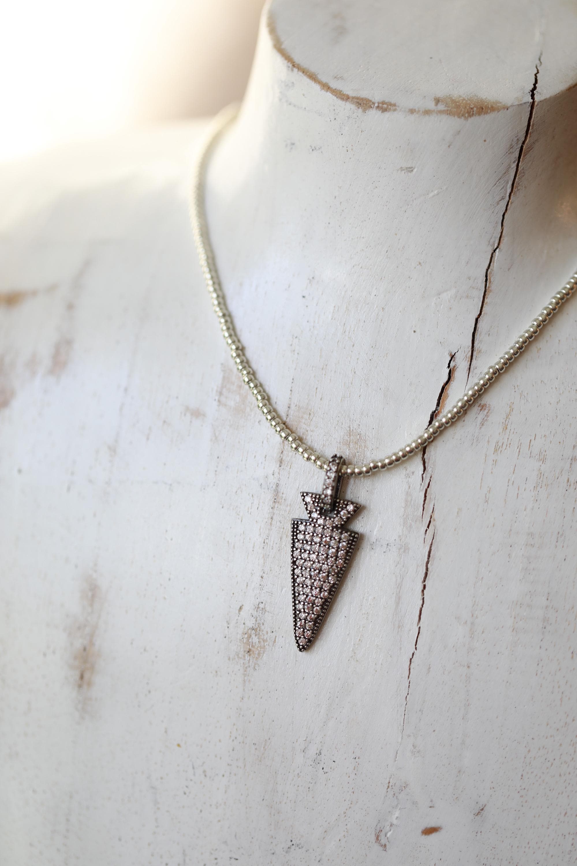 A little sparkle, a little edge—this micro pavé arrowhead pendant is the kind of piece you’ll reach for on repeat. The silver-plated brass arrowhead is covered in tiny cubic zirconias for that subtle “catch the light” shimmer, strung on sleek glass beads and finished with a sterling silver lobster clasp + chain for an elevated, wear-everywhere feel.