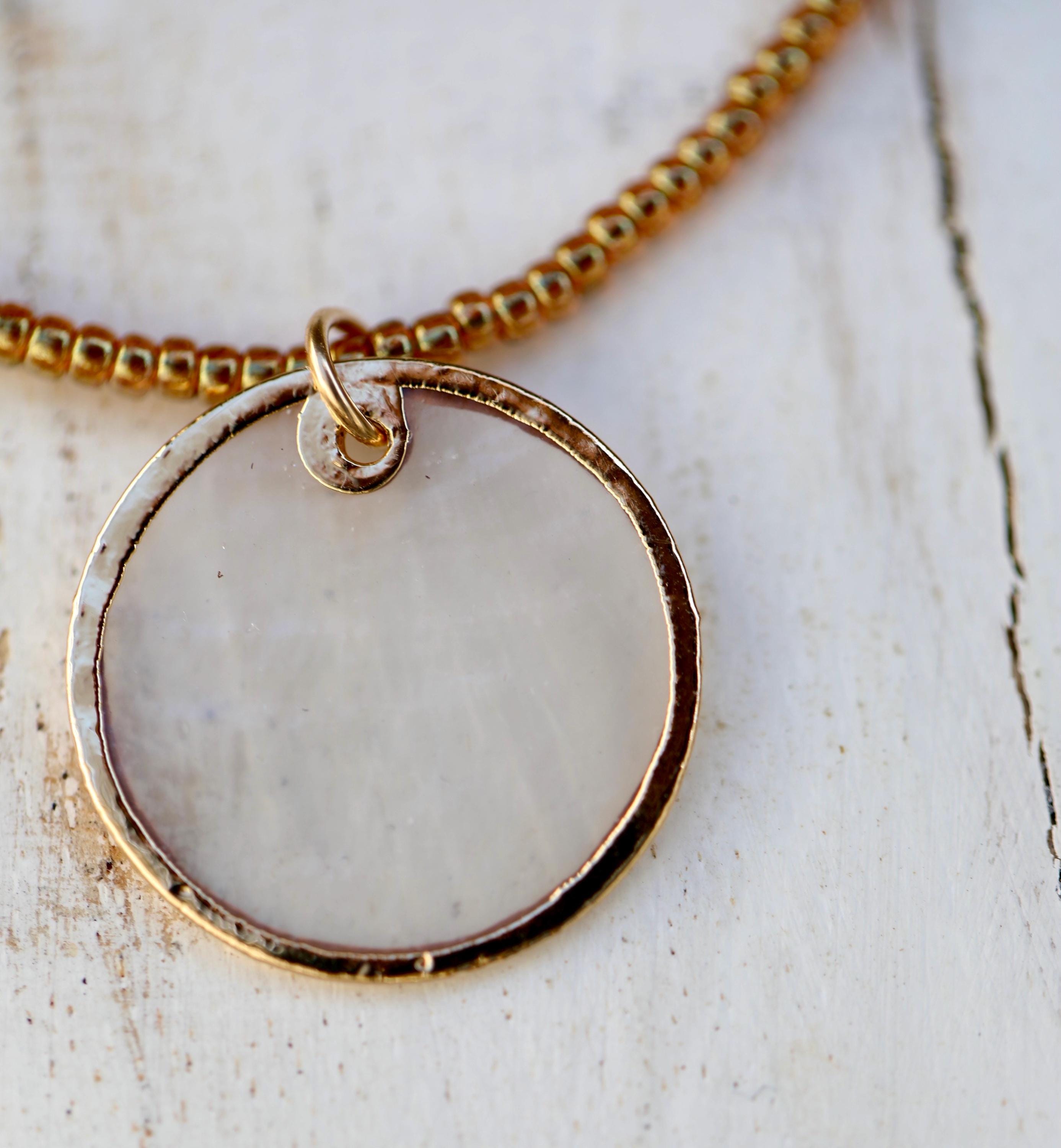 βοΈ This delicate necklace features a luminous Capiz shell pendant with a warm gold finish, suspended from a strand of Japanese glass beads in a rich honey tone. The result is an effortless piece that feels both earthy and refined.